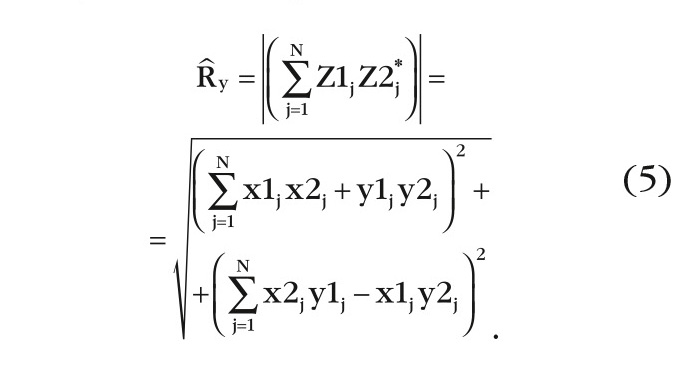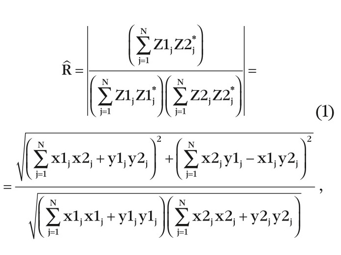 где – ˆR оценка модуля коэффициента корреляции, N – число накоплений по независимым выборкам. Z1j = x1j + iy1j, Z2j = x2j + iy2j – комплексные выборки сигналов на входе умножителя, разнесённых по времени или частоте в виде аддитивной смеси шума и коррелированного сигнала. Квадратурные компоненты шума имеют нормальное распределение с дисперсией равной 1 и средним значением равным 0.
