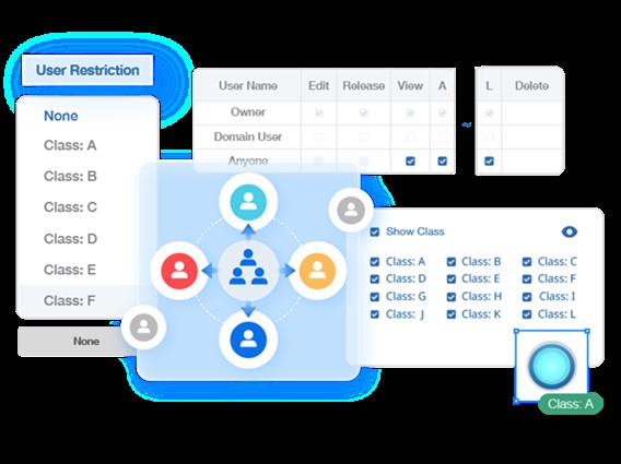 Параметр «Ограничения для пользователей» на панели «Свойства» позволяет присвоить каждому виджету одну из 12 категорий (от класса A до L), каждая из которых управляется индивидуально.