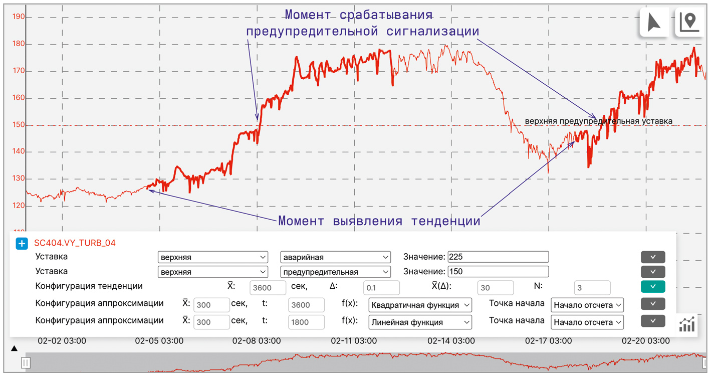На рис. 2 представлена экранная форма, на которой подобраны коэффициенты выявления тенденции для параметра виброперемещения вала турбины со стороны муфты (компрессора) по оси Y (VY_TURB_04). Жирные участки временно́й диаграммы соответствуют интервалам времени, в которые должно быть активно событие «Выявлена тенденция на рост параметра VY_TURB_04». Соответственно в будущем при возникновении схожего либо более явно выраженного роста значений параметра будут сформированы соответствующие события.