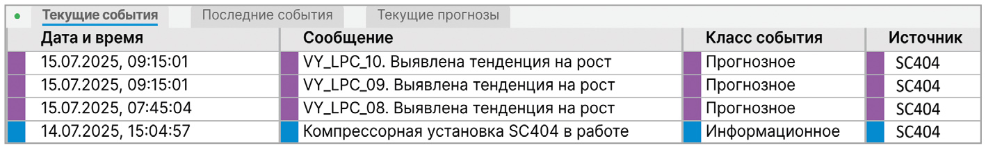 В СППР Sdisol PAD при возникновении тенденций, помимо формирования соответствующих событий и их отображения в области уведомлений (рис. 3), предусмотрена также цветовая подсветка параметров, по которым выявлена тенденция на мнемосхемах, что видно на рис. 1 для параметров: VX_TURB_03, VY_TURB_04, VZ_TURB_05, VZ_TURB_06 и VZ_LPC_10, которые выделены фиолетовой рамкой. После того как мы предусмотрели выявление рисков аварийных остановов по вибропараметрам (а появление тенденций изменения значений параметров в сторону уставок – это и есть риски аварийных остановов), нам потребовалось оценить эти риски. Для этого мы использовали функцию расчёта времени до достижения уставки значениями параметра и функцию расчёта мгновенной скорости изменения значений параметра.