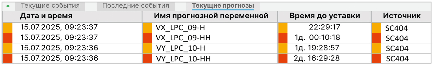 После настройки конфигураций аппроксимаций и функций расчёта времени до уставок в области уведомлений для параметров, по которым была выявлена тенденция, будут отображаться значения прогнозного времени до достижения соответствующих уставок (см. рис. 4). Эти прогнозные значения будут непрерывно обновляться до тех пор, пока значения соответствующих параметров будут приближаться к заданным уставкам.