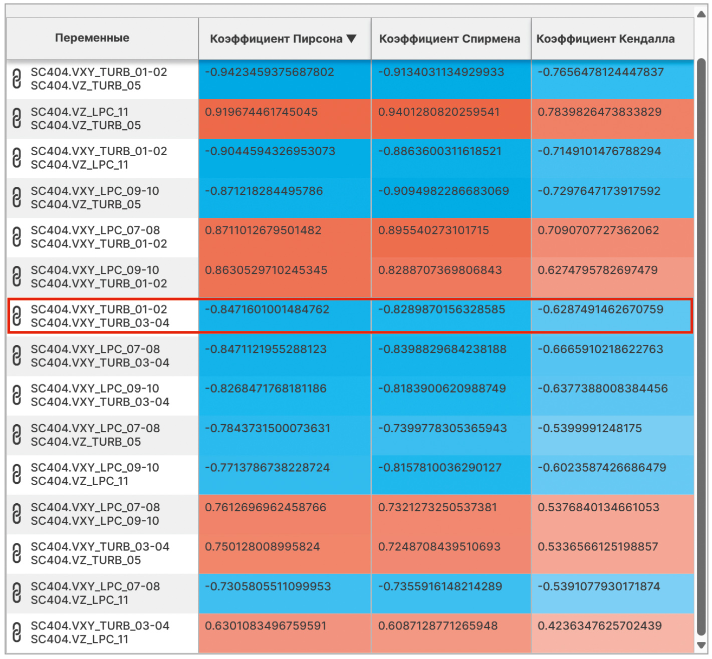 Продолжая анализировать рассчитанные коэффициенты корреляции, мы обратили внимание, что наибольшие по модулю значения коэффициентов Спирмена и Кендалла рассчитаны для осевого сдвига вала турбины и осевого сдвига вала компрессора (VZ_TURB_05, VZ_LPC_11). Столь сильная корреляция показалась нам странной, так как компрессорная установка имеет муфту между валами компрессора и турбины, которая, в свою очередь, предусматривает их независимое перемещение вдоль продольных осей. Впоследствии, после останова установки, внимательно обследовав муфту, эксплуатирующая организация сообщила о выявленном дефекте в муфте, который приводил к «закусыванию» валов при наличии момента на муфте и, как следствие, передаче усилия осевого сдвига с одного вала на другой, что не допускается конструкцией данной компрессорной установки. Таким образом, уже на этапе конфигурирования системы, в ходе анализа исторических данных, была выявлена неисправность, которая не могла быть определена предусмотренными системами параметрической диагностики и пока ещё не привела к негативным последствиям.