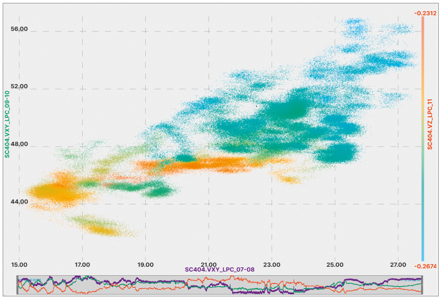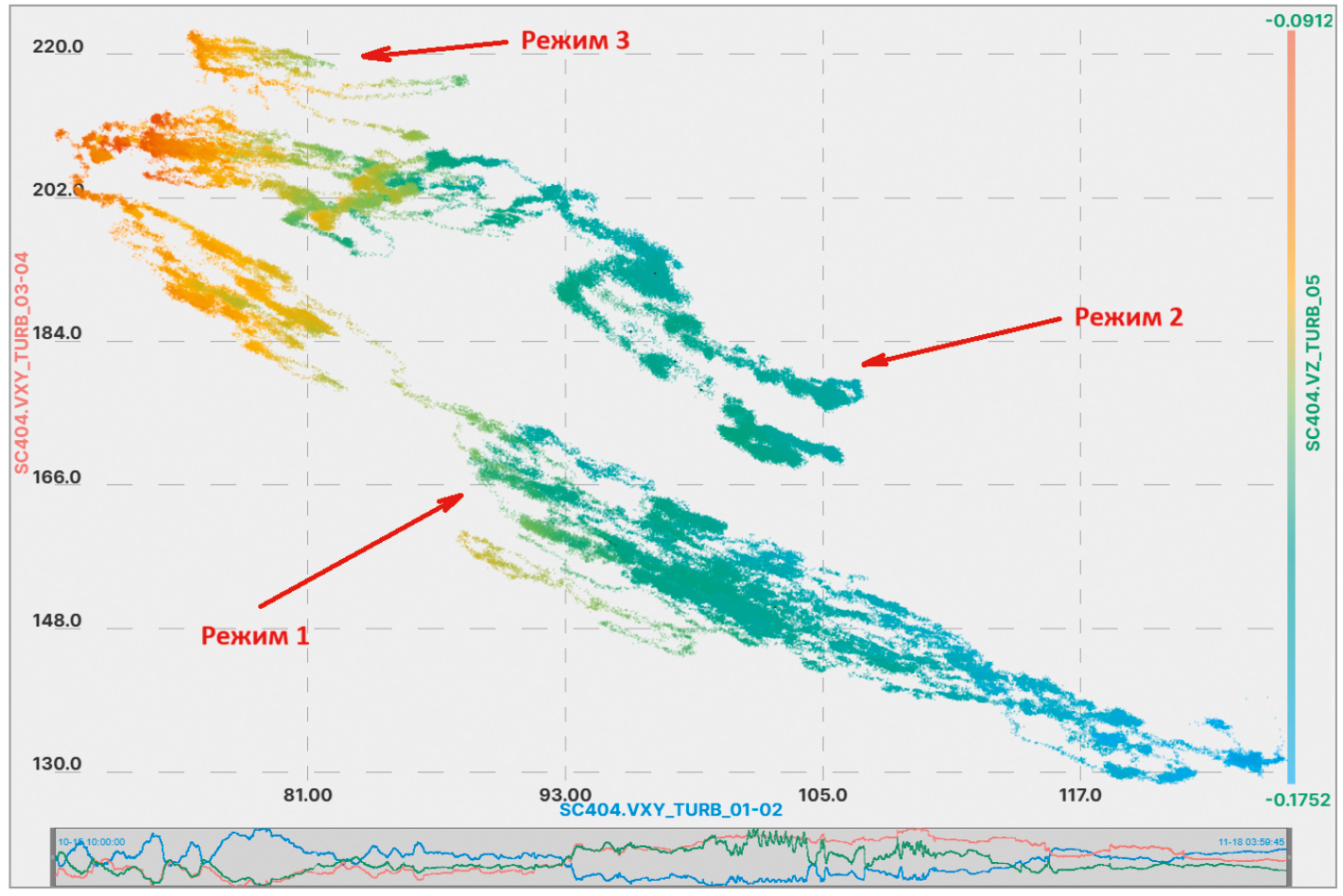 Особенно интересной нам показалась отрицательная корреляционная связь между значениями вибрации вала турбины с разных сторон (на рис. 5 она выделена красной рамкой). Для более внимательного изучения этой зависимости мы использовали визуальный способ анализа, который также предусмотрен в нашей системе. При визуальном анализе на координатную плоскость наносятся точки, координаты которых соответствуют значениям пары параметров в единый момент времени, при этом распределение этих точек показывает корреляционную связь между этими двумя параметрами.