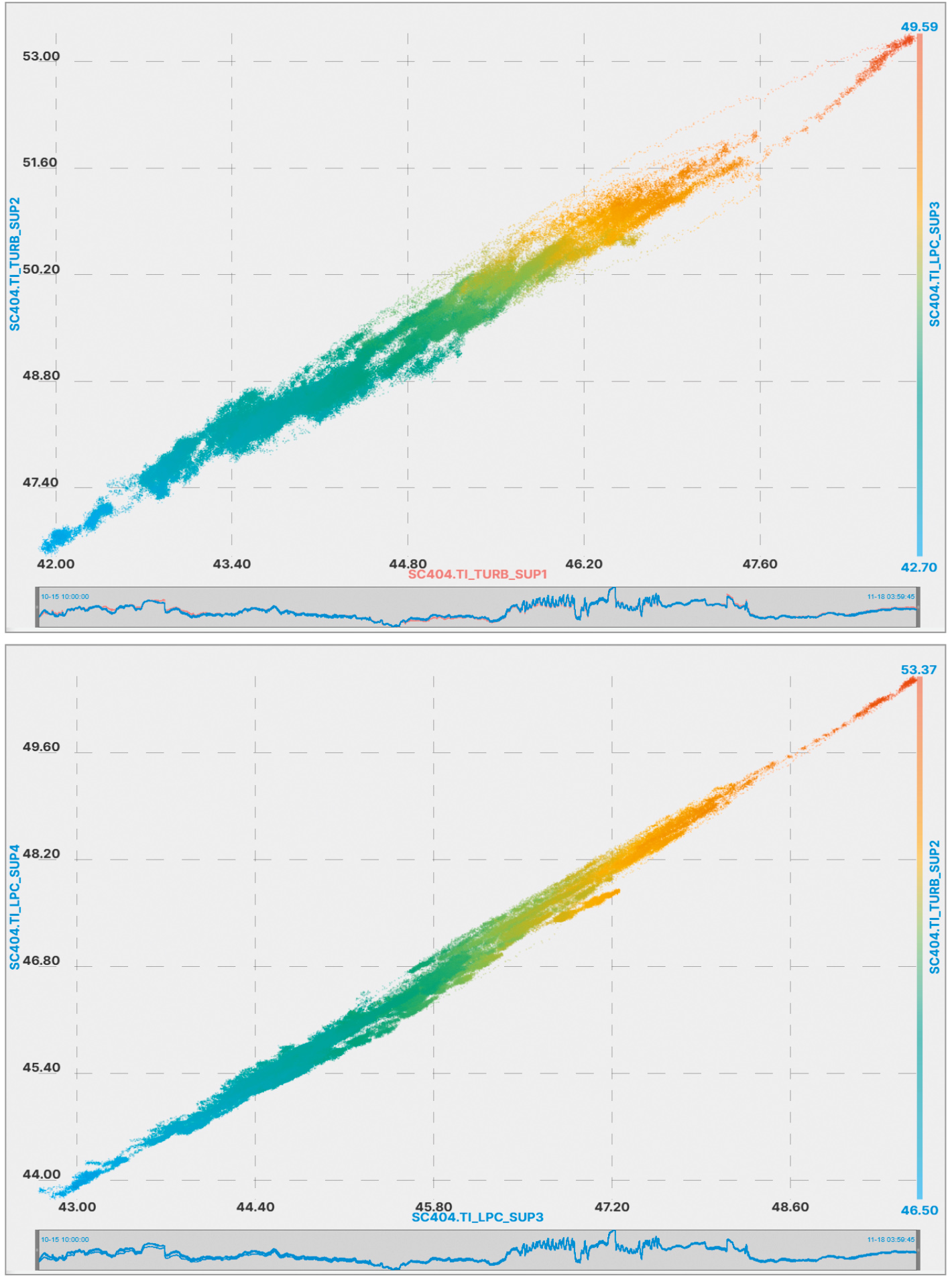 На рис. 8 представлены две диаграммы корреляции двух групп параметров: TI_TURB_SUP1, TI_TURB_SUP2, TI_LPC_SUP3 и TI_LPC_SUP3, TI_LPC_SUP4, TI_TURB_SUP2.