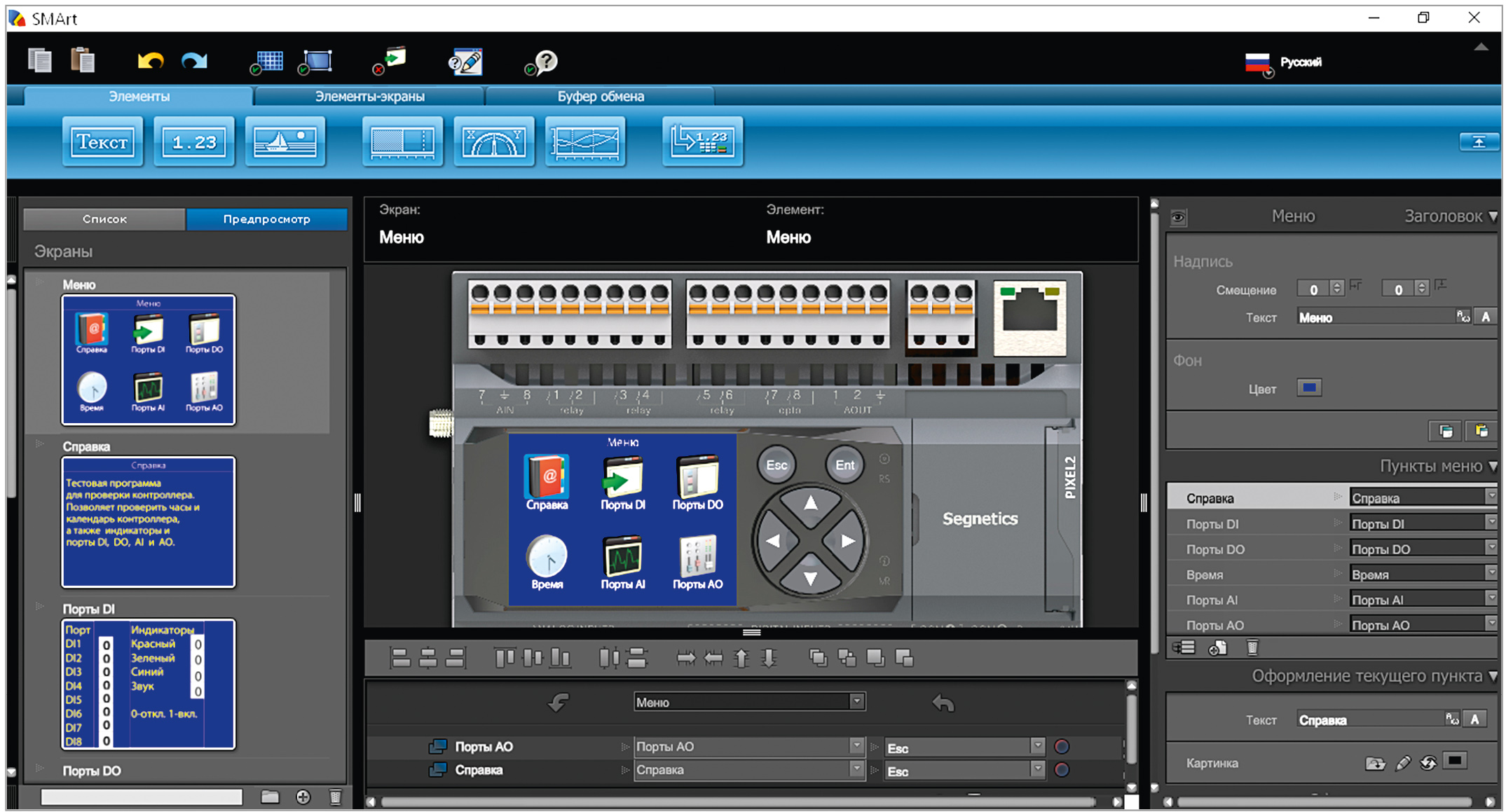 Интерфейс оператора разработан с помощью встроенного в среду разработки программного инструмента SMArt и представлен на рис. 2. Он состоит из нескольких элементов меню с пиктограммами и названиями, поясняющими назначение этих элементов.