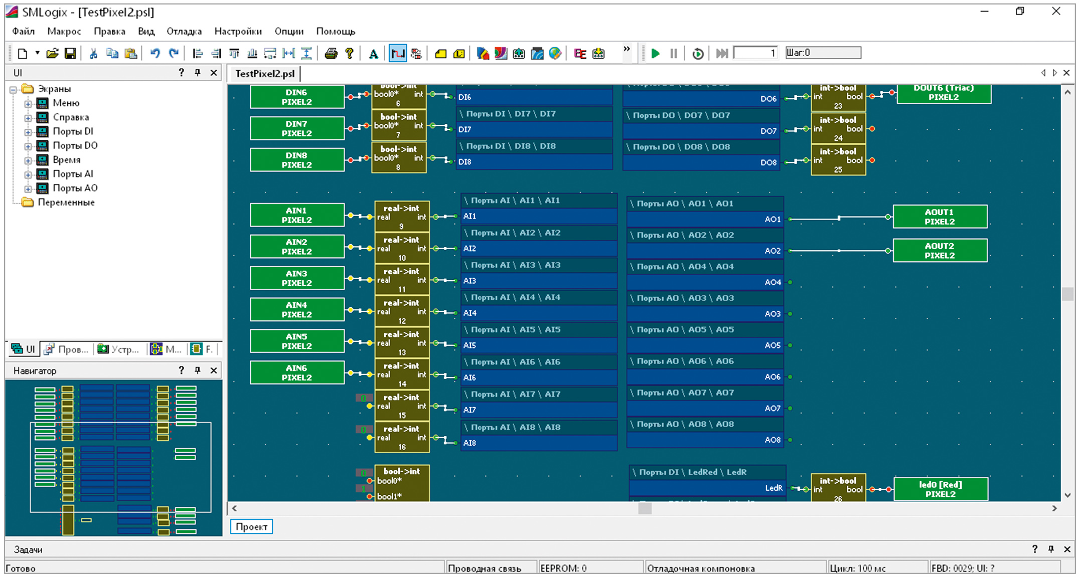 Рассматриваемая здесь тестовая программа разработана для ПЛК Pixel 2 компании Segnetics. Данную программу можно легко преобразовать для проверки других контроллеров упомянутой компании, таких как Matrix, SMH4 и т.п. Это делается путём изменения типа модели ПЛК в проекте с последующей трансляцией и записью в контроллер.Программа создана в свободно распространяемой среде разработки SMLogix [2] на языке программирования диаграмм функциональных блоков FBD (Function Block Diagram). Знакомство с этой средой, её установкой на компьютер и созданием проектов в ней изложено в источнике [3].