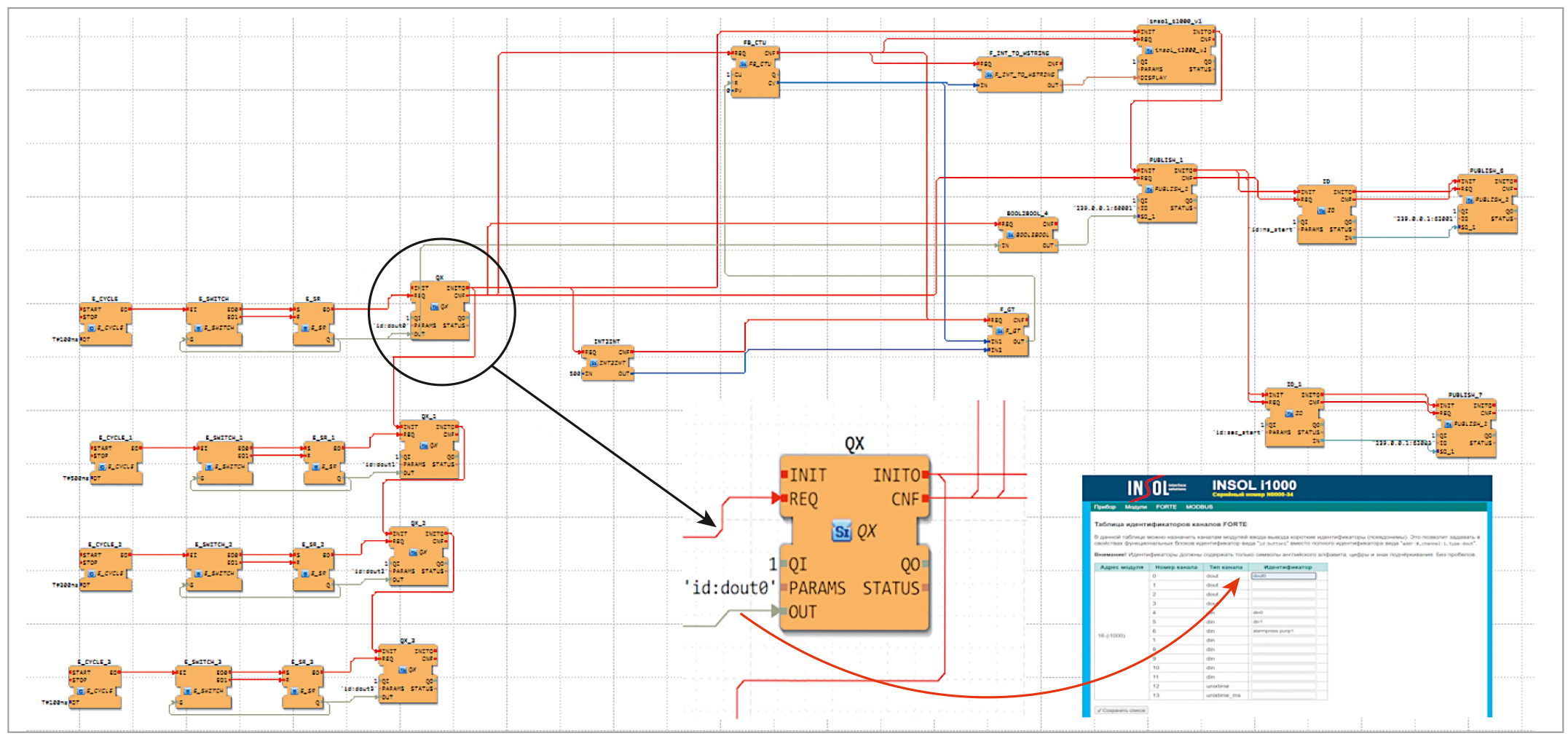 Вторым базовым элементом системы выступает распределённый контроллер INSOL-1000. Его архитектура строится на общей шине Insol-BUS, к которой подключаются необходимые модули расширения (дискретные, аналоговые и другие). Адресация модулей задаётся механическим переключателем на лицевой панели, а система их автоматически распознаёт, максимально упрощая процесс конфигурации и замены.Ключевой особенностью контроллера является присвоение физическим каналам именных алиасов. Вместо работы с малопонятными «сырыми» адресами (вроде addr:0,channel:1,type:dout5) инженер оперирует понятными именами, например «Температура_Реактора_А». Эти алиасы напрямую доступны в среде разработки 4DIAC (реализация стандарта IEC 61499), что значительно ускоряет программирование и снижает количество ошибок.