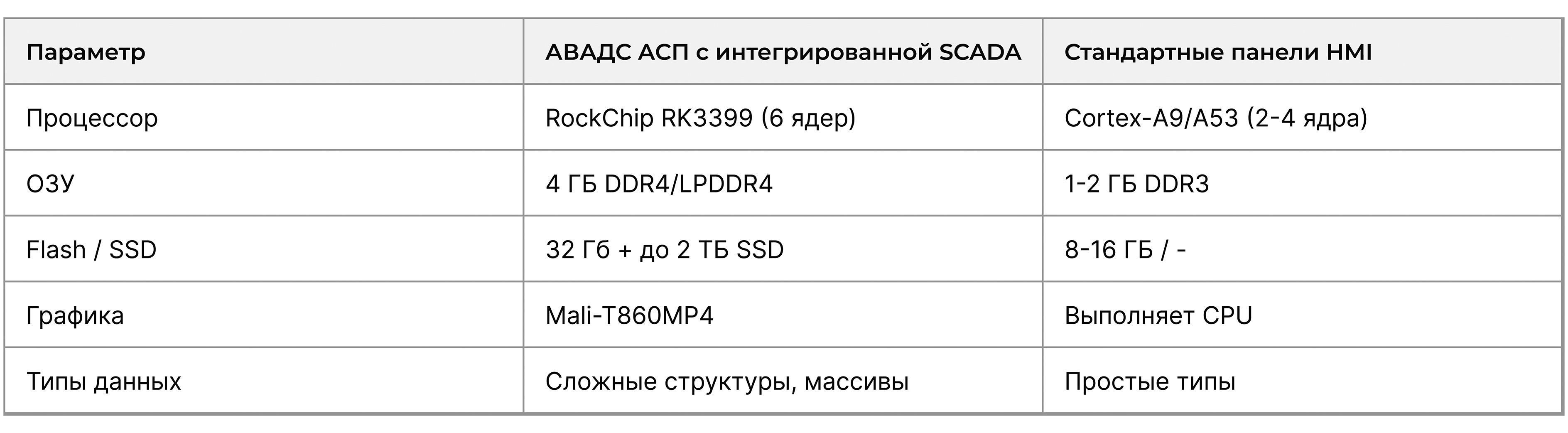 По своим техническим характеристикам и функциональным возможностям сенсорные панели АВАДС АСП отличаются от других представителей в своём классе устройств. Обобщённая сравнительная таблица ниже наглядно демонстрирует превосходство аппаратной части панелей АВАДС. Полные технические данные панелей и ПЛК АВАДС представлены на сайте avads.ru. Там же есть возможность загрузить 3D-модели и чертежи устройств.