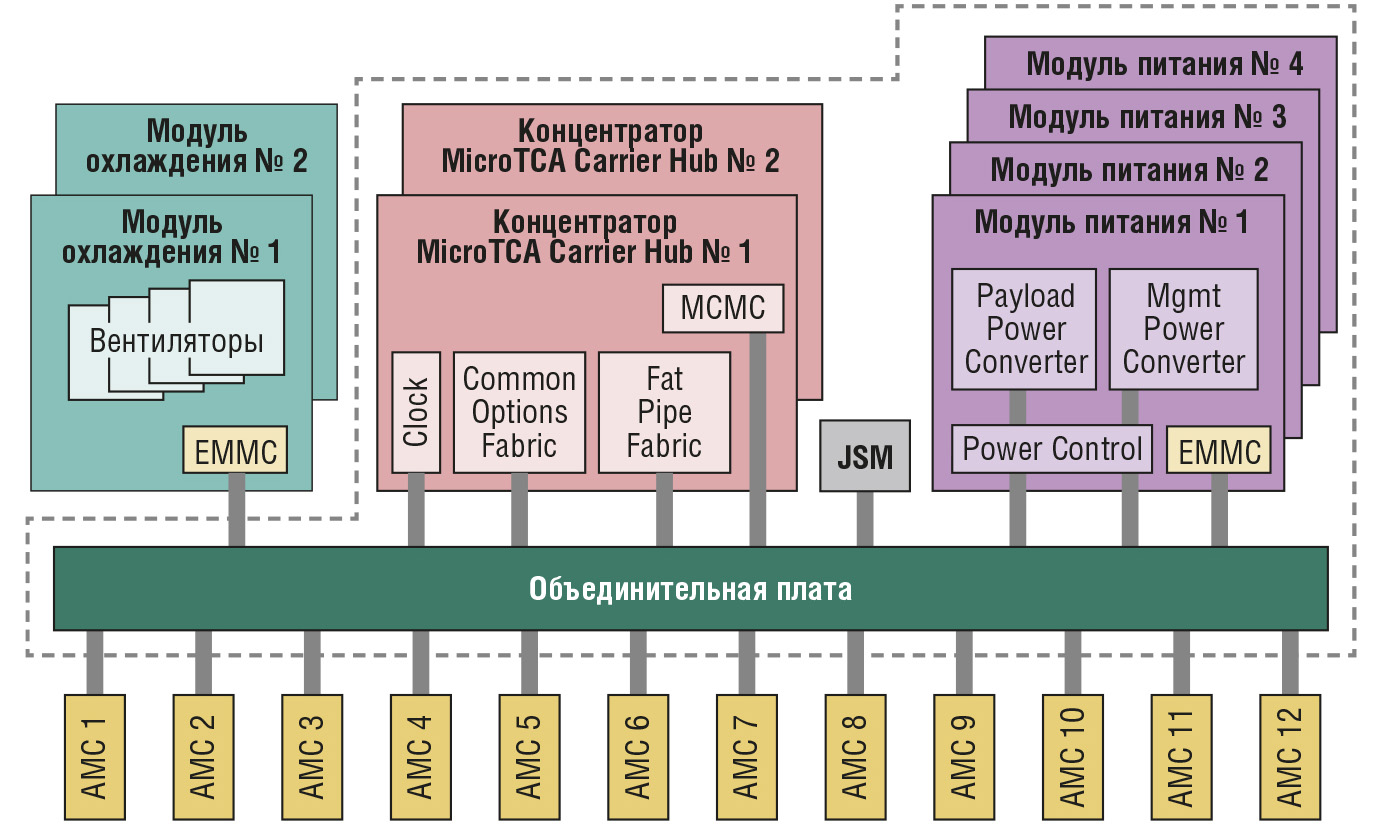 Производители модулей AMC быстро пришли к выводу, что можно построить небольшую версию системы ATCA, используя только AMC-модули (рис. 2).