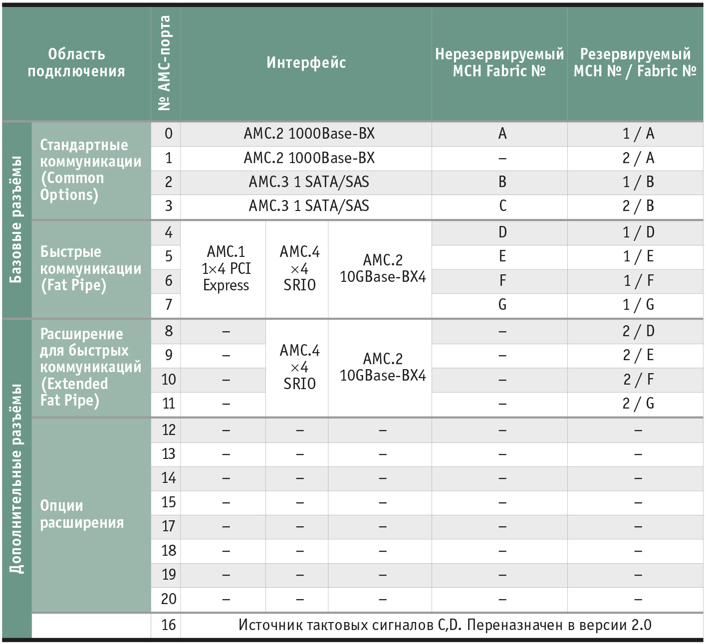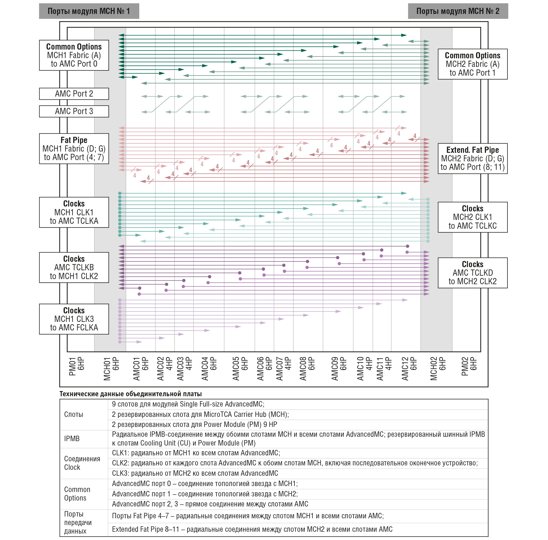 Коммутатор порта Fabric Fat Pipe [D:G] (как правило, это шины Ethernet или PCIe) подключён к краевым разъёмам 3 и 4 на MCH-модуле. Краевой разъём 3 коммутируется с первыми шестью AMC-модулями, а разъём 4 – с оставшимися шестью (рис. 5).