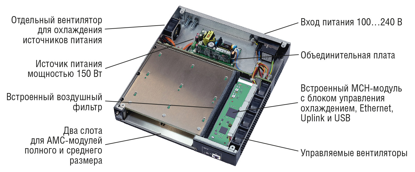 Шасси с двумя слотами для AMC-модулей оснащено встроенным MCH-модулем, а встроенный бескорпусный мезонинный модуль питания расположен позади объединительной платы. Так как это шасси имеет нормальный функционал управления, к модулям AMC особых требований не предъявляется.