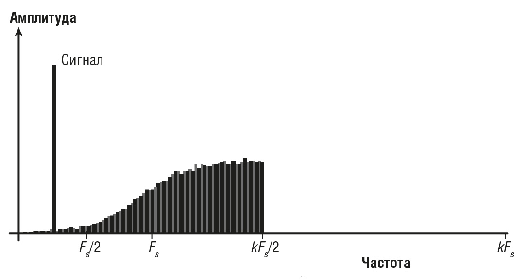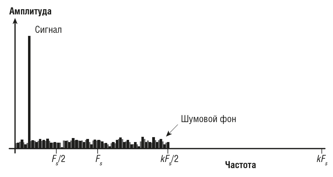 Дискретизация сигнала в АЦП обычно происходит с разрешением, значительно превосходящим номинальную дискретизацию устройства. В результате передискретизации шум квантизации смещается за пределы частоты дискретизации, что приводит к снижению ошибок преобразования. Этот эффект проиллюстрирован на рис. 4.