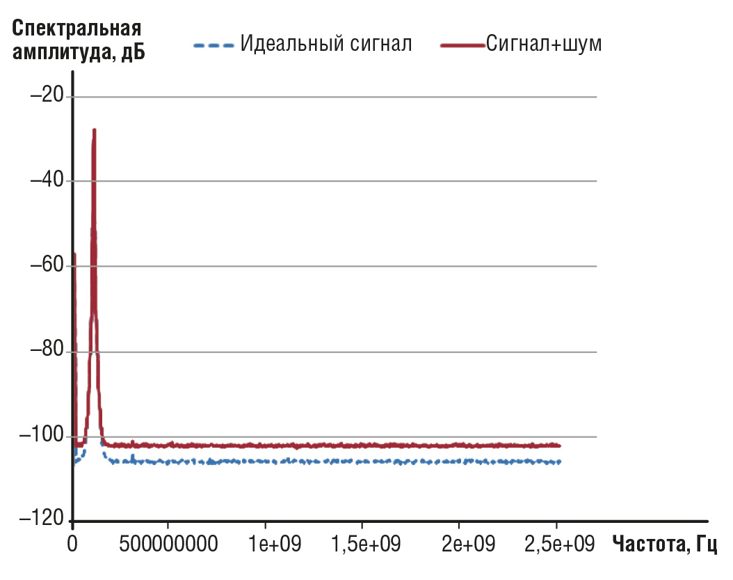 Можно видеть, что добавление спектрально плоского шума поднимает базовую линию спектра. Любые сигналы с амплитудой ниже этого шума будут ограничены не только динамическим диапазоном цифрового преобразователя, но и этим смещением.