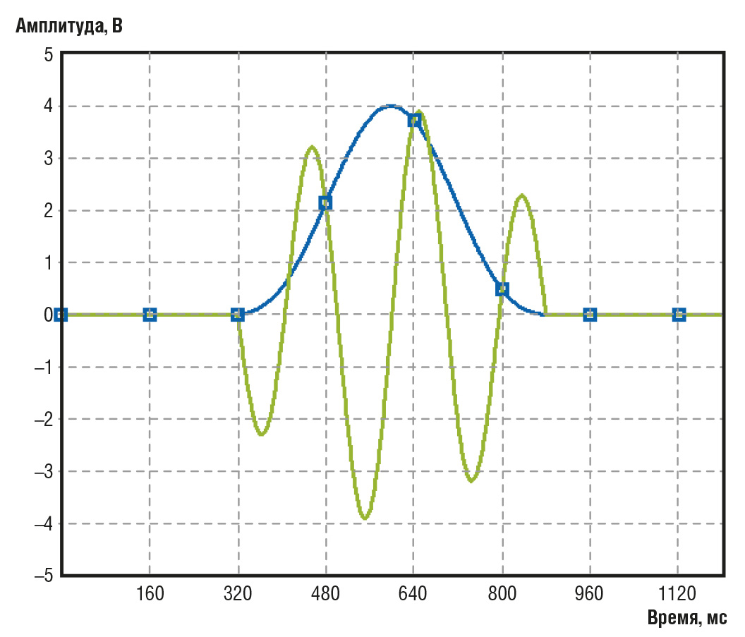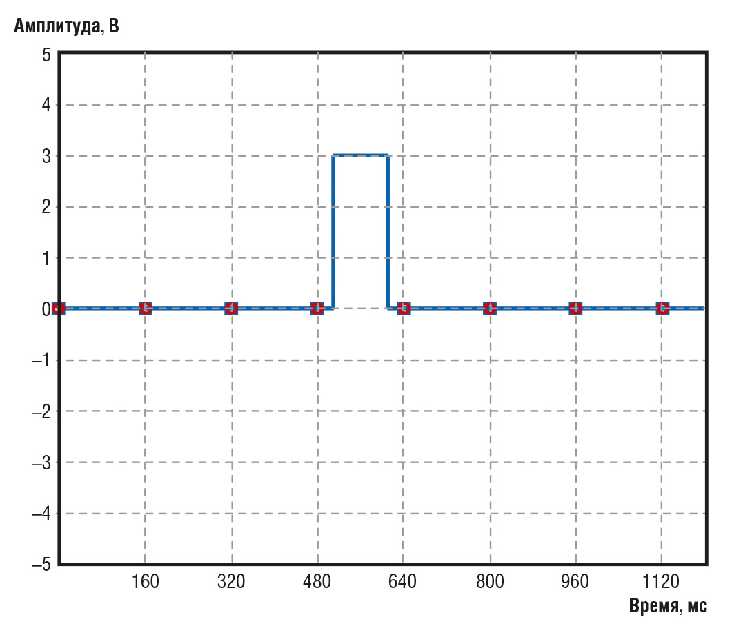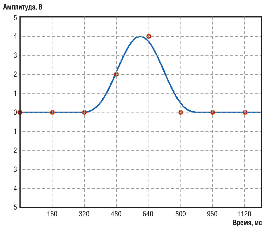 Первая стадия оцифровки – определение уровней аналогового сигнала в n точках, отделённых друг от друга равными временны́ми промежутками Δt. В данном примере эти промежутки выбраны равными 160 мс (рис. 11).