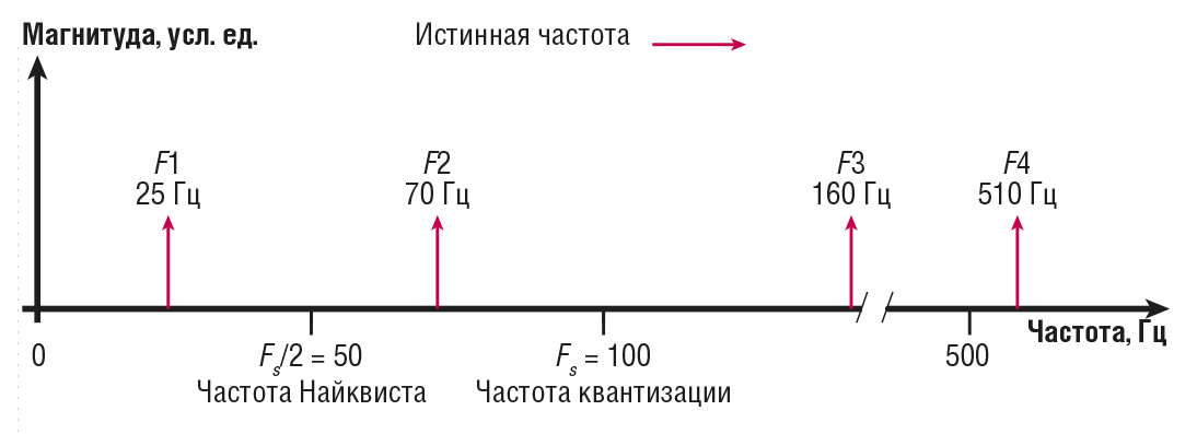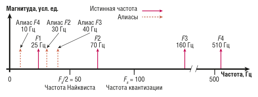 Например, F1 (25 Гц) появляется на ожидаемой частоте, но частоты выше частоты Найквиста появляются как алиасы. Алиас F2 = 100 – 70 = 30 Гц; алиас F3 = = 2×100 – 160 = 40 Гц; алиас F4 = 5×100 – 510 = 10 Гц.