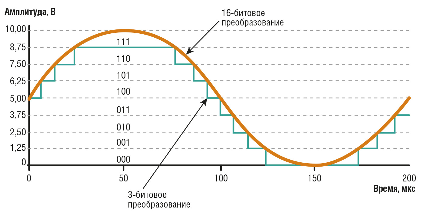 Точность преобразования АЦП определяется числом бит в оцифрованном значении аналогового сигнала. Для N-битового преобразователя число дискретов, на которые разбивается весь диапазон измерения, определяется как 2N. Например, для 12-битового АЦП эта величина будет равна 4096. При этом младший значащий бит определяет минимальное значение аналогового сигнала, которое может быть оцифровано. В описанном случае это 1/4096, или 2,4×10–4. Чтобы преобразовать это значение в вольты, надо взять максимальный входной диапазон дигитайзера и разделить его (в нашем случае) на 212. В таблице 1 представлено сравнение точности преобразования в зависимости от битрейта дигитайзера.
