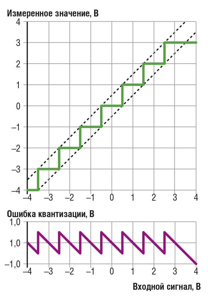 Вторая стадия – округление полученных значений до целочисленных отсчётов. Каждый отсчёт представляет малое приращение q измеряемого сигнала за интервал квантизации. Округление аналогично искусственному внесению помех (шума). Мощность этого шума при некоторых допущениях равна q2/12 в полосе от нуля до частоты Найквиста2 1/(2×Δt). Таким образом, плотность мощности обратно пропорциональна интервалу выборки. Надо помнить, что этот шум квантизации – лишь теоретический минимум. Для минимизации шума квантизации в критичных приложениях используют дигитайзеры высокого разрешения – до 24 бит. Для дигитайзеров (как для всех полупроводниковых устройств) также характерен шум, преобладающий на низких частотах, например ниже 1 Гц. Таким образом, 24-битовый цифровой преобразователь не обязательно выдаёт оцифрованное значение 24 бита: последние несколько бит могут представлять ошибочную информацию благодаря описанным эффектам.