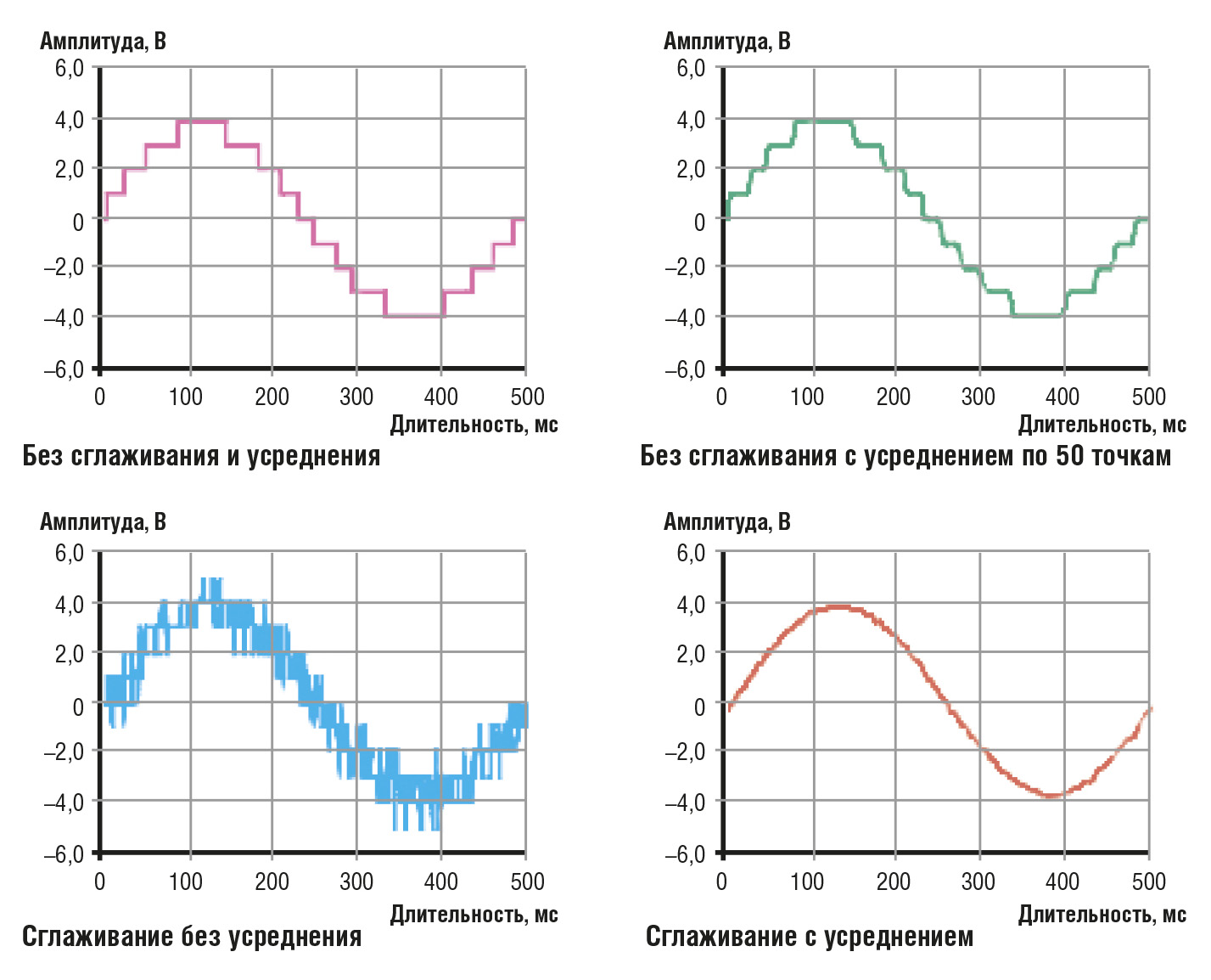 Таким образом, мы исключаем резкие скачки сигнала вверх–вниз между последовательными выборками. Сигнал, сглаженный путём такого усреднения, в цифровом виде более адекватно отражает исходный.