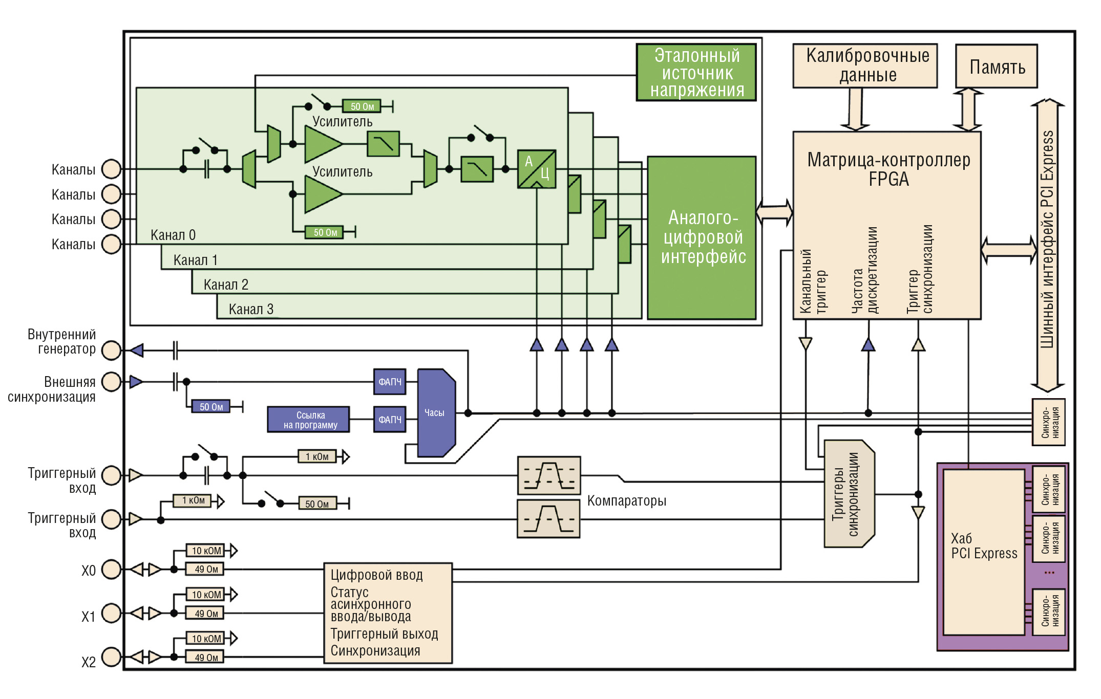 Таким образом, быстрые 8-канальные карты Spectrum с интерфейсом PCI Express Gen 2 обеспечивают прямое подключение каждой линии, позволяющее получить требуемую пропускную способность для каждого канала карты. Серия M4i.44xx-x8 специально спроектирована для быстрого высокоточного преобразования аналоговых сигналов. Каждый входной канал имеет для этих целей собственный аналогово-цифровой преобразователь и собственный усилитель сигнала (рис. 23).
