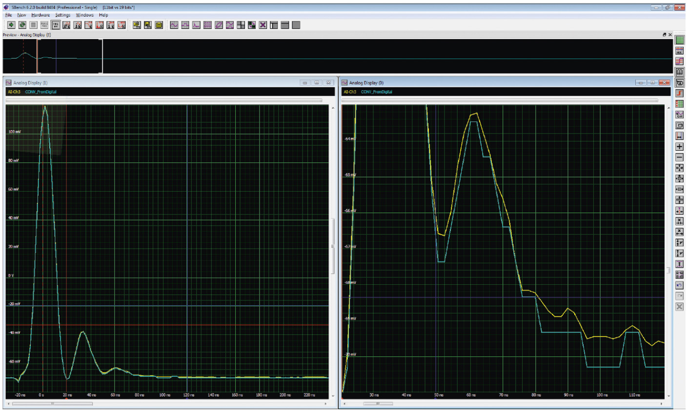 Слева показан весь сигнал, справа – вырезка в увеличенном масштабе. ENOB3 дигитайзера (жёлтая кривая) составляет более 11,6 разрядов при частоте 10 МГц. Наложенная смоделированная программно кривая (голубой цвет) для ENOB, равного 10 разрядам, иллюстрирует степень ухудшения качества даже при незначительном понижении разрядности. Обратите внимание, что голубая кривая гораздо более грубая и не отражает низкоамплитудные детали сигнала. Таким образом, при подборе дигитайзера необходимо принимать во внимание его истинное разрешение, ограниченное базовым шумом, а также параметры SNR4, SINAD5 и ENOB. Нужно иметь в виду такие аппаратные особенности дигитайзера, как возможности настройки диапазона и преобразования входного сигнала.