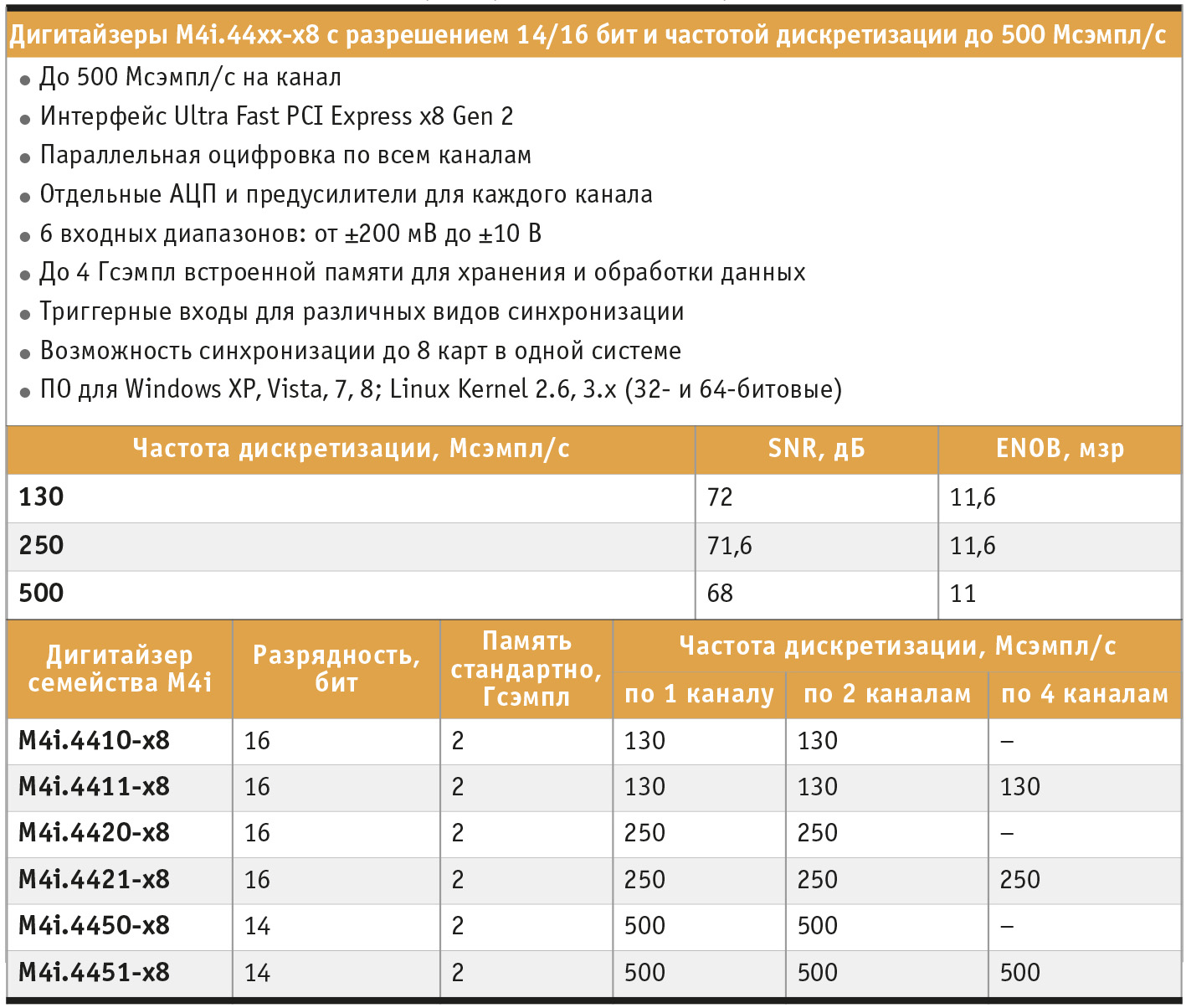 Такая структура позволяет параллельно обрабатывать сигналы на всех входах с 14- и 16-битовым разрешением без всякой фазовой задержки. Отказ от технологии чередования в пользу индивидуальных АЦП гарантирует лучшее качество сигнала без искажений вплоть до 500 Мсэмпл/с. Большой объём встроенной памяти обеспечивает буфер для работы на высоких скоростях преобразования при высокой дискретизации. Основные технические характеристики платы приведены в таблице 2.