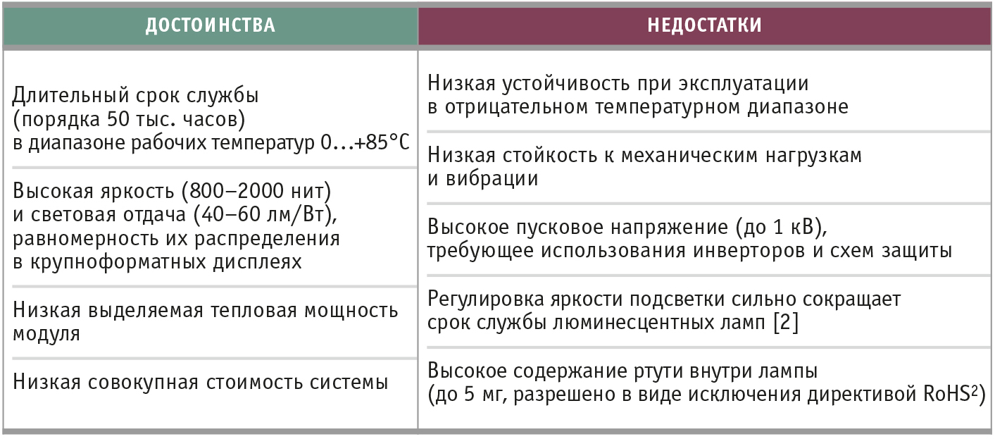 Тайваньская компания LITEMAX, основанная в 2000 году, акцентирует внимание на разработке и производстве жидкокристаллических дисплейных панелей высокой яркости. За десять лет своего существования она зарекомендовала себя поставщиком надёжных и современных решений, выпустив на рынок систему задней подсветки Very High Brightness (VHB), которая обеспечивает высокую яркость в диапазоне 800–2000 нит1. В её основу была заложена проверенная временем технология подсветки на основе люминесцентных ламп с холодным катодом (Cold Cathode Fluorescent Lamp, далее CCFL). Технология на сегодняшний день отработанная и достигшая в определённой степени своего совершенства. Особенно хорошо это прослеживается и подробнейшим образом описано в работе [1]. Здесь же, для систематизации знаний, приведём кратко основные выводы в табл. 1.