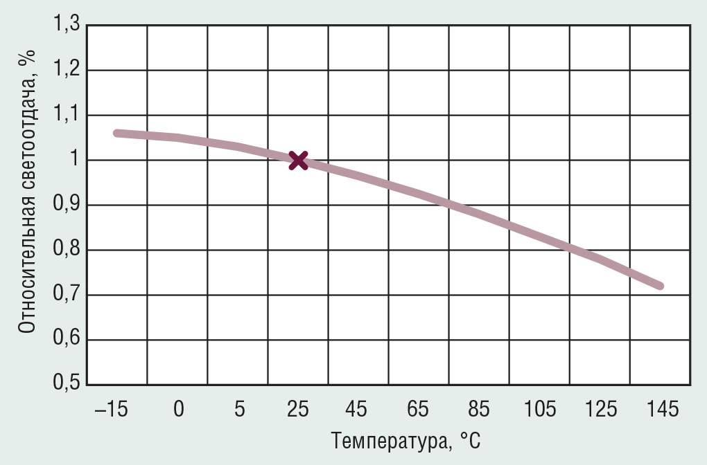 Одна из основных трудностей – это значительное выделение тепла источниками света – светодиодами. Особенно это заметно с увеличением яркости (пропорциональной увеличению силы тока), когда световая отдача3 падает, а значительное количество потребляемой энергии преобразуется в тепло (рис. 1).