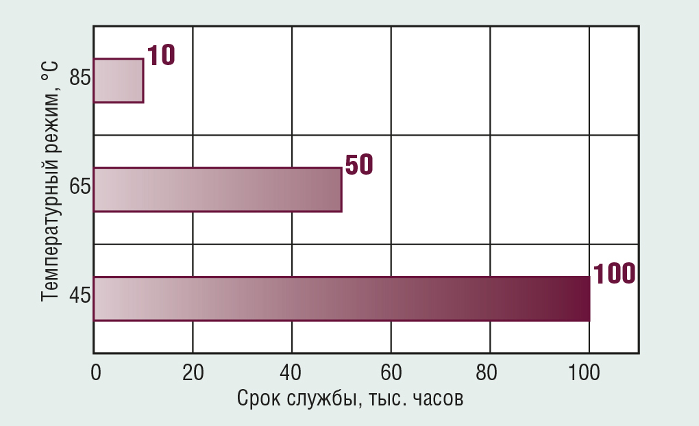 Следует заметить, что приведенное значение в 65°С достижимо в лучших на сегодняшний день экземплярах при температуре окружающей среды 25°С, принятой за стандартную при расчётах (рис. 1). Максимальные же значения срока службы достигаются при эксплуатационных температурах изделия, близких к 0°С5.