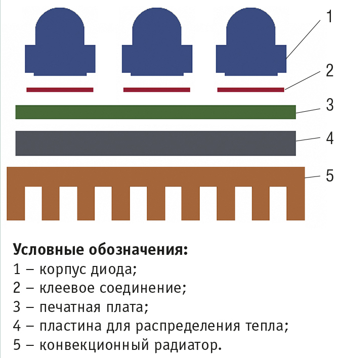 Принципиальная схема монтажа элементов подсветки, используемая большинством разработчиков, приведена на рис. 3. Корпус диода через клеевое соединение размещается на печатной плате, которая через пластину для распределения тепла монтируется на конвекционный радиатор, излучающий тепло в атмосферу.
