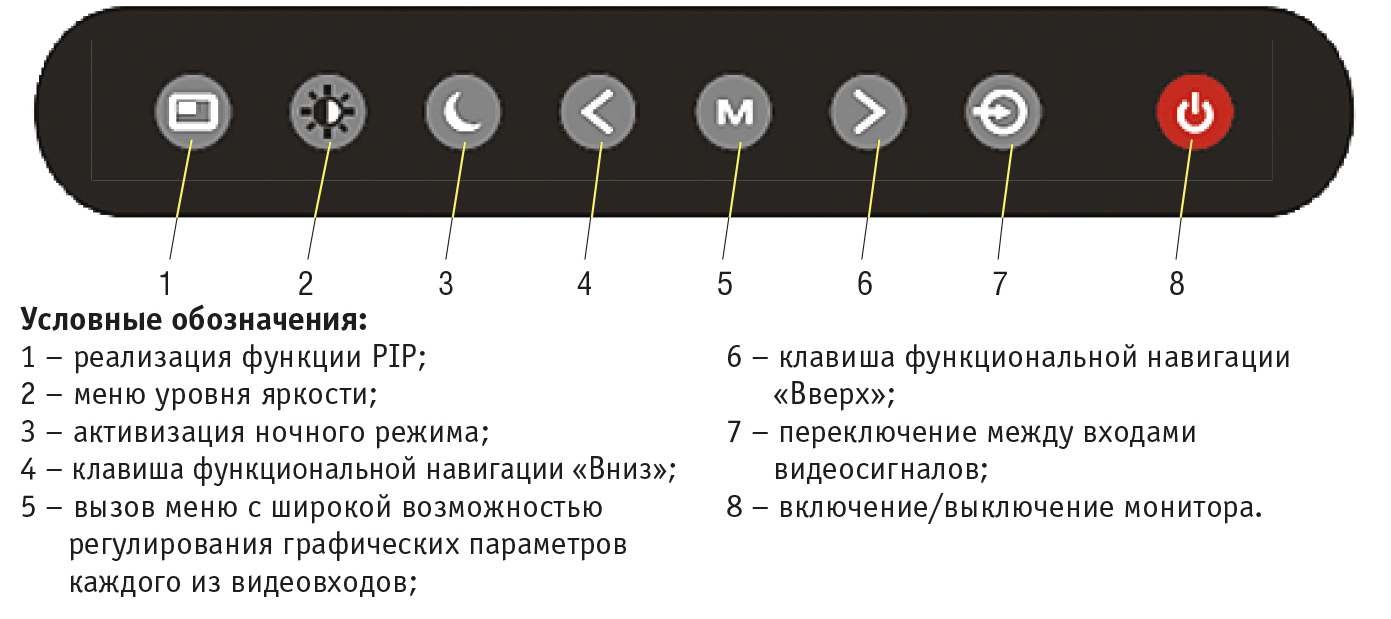 При нажатии на клавишу 5 (рис. 8) становится доступным меню с цветовой настройкой сигнала каждого из видеоинтерфейсов. Мгновенное снижение уровня яркости возможно вплоть до минимального значения в 0,5 нит, заложенного в функции «ночной режим», которая активизируется клавишей 3.