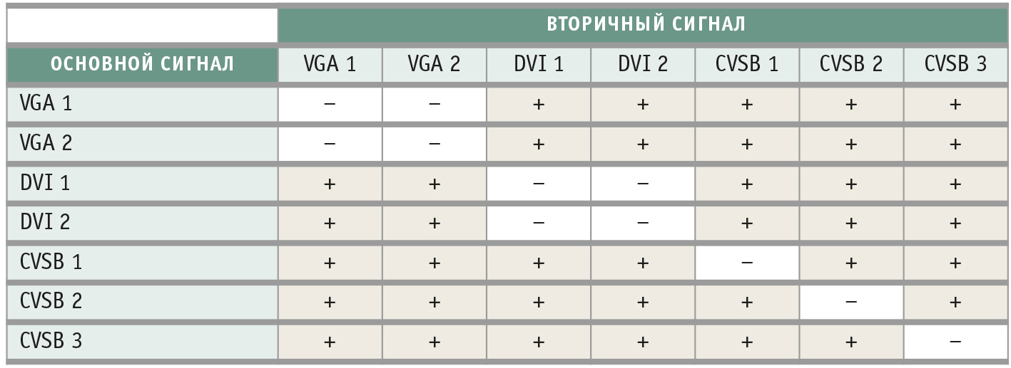 Примечательна возможность отображения картинки одновременно от двух источников, так называемая функция Picture in Picture (PIP)8, опция, редко встречающаяся в устройствах подобного класса, но хорошо знакомая нам на примере некоторых телевизоров. Площадь дисплея может быть разделена по вертикали на две пропорциональные области, или одно из изображений уменьшено и расположено в удобном месте на поверхности экрана. В табл. 2 приведены возможные сочетания различных источников сигнала, доступных для одновременного отображения.