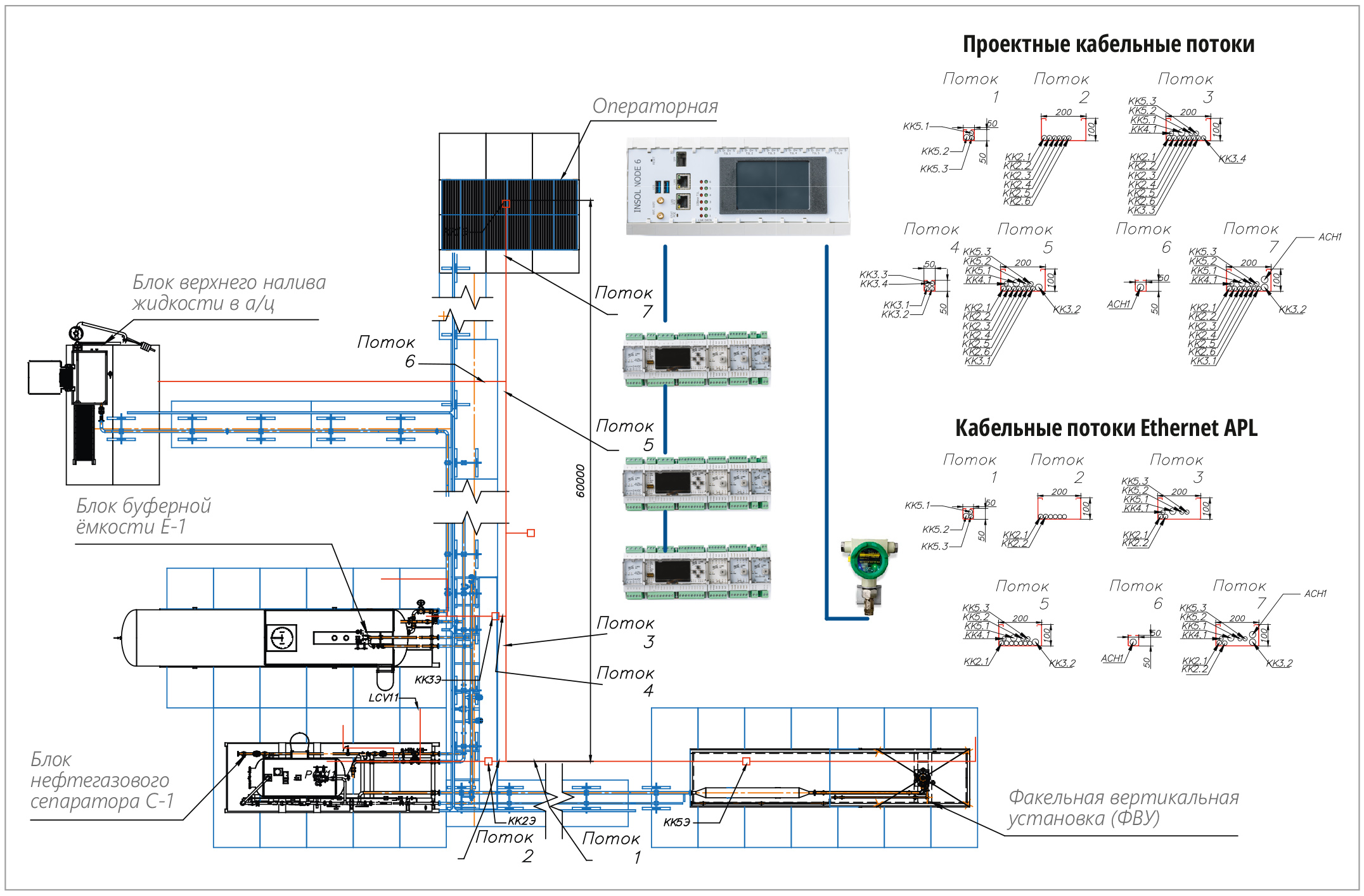 Классическая архитектура автоматизации подобного объекта – это монолитная, кабельно-центричная система. Её сердцевину составляют протяжённые эстакады с сотнями контрольных кабелей, сходящихся в операторную, отдельные щиты управления двигателями и исполнительными механизмами, центральный контроллерный шкаф и интеграция в АСУ ТП верхнего уровня.Архитектура на основе APL меняет эту парадигму кардинально. Вместо паутины индивидуальных кабелей развёртывается единая, отказоустойчивая Ethernet-сеть. В основе её структуры полевой коммутатор с несколькими «гирляндами» – сегментами, каждый из которых обслуживает ключевой технологический модуль (насосная, ТФС, печь). Каждая такая «гирлянда» обладает заложенной расширяемостью, при условии использования соответствующего оборудования. Совместим данную гирлянду с генеральным планом нашей УПН и сравним кабельные потоки классического и APL решения (рис. 2).