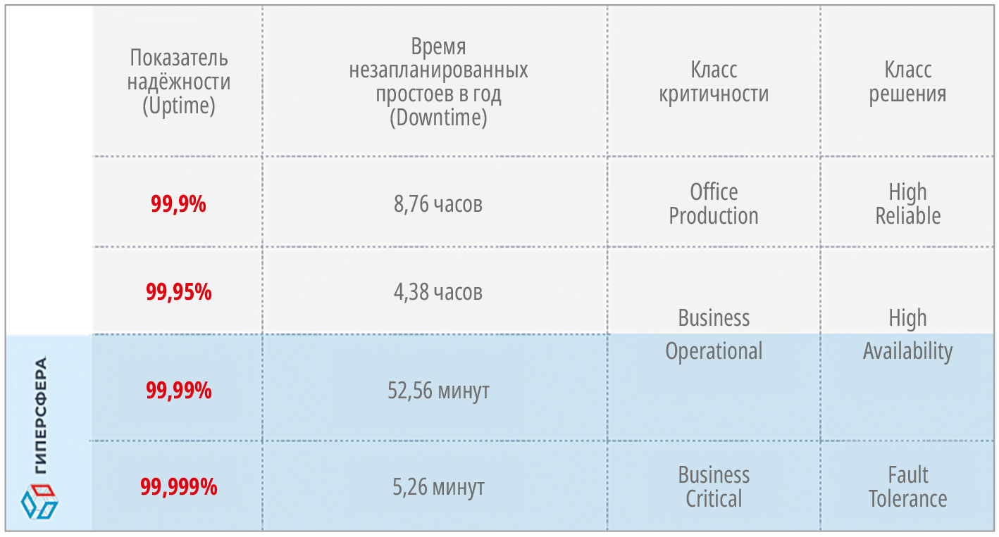 «ГиперСфера» позволяет обеспечить класс доступности от 99,99% до 99,999%, что проиллюстрировано на рис. 3.