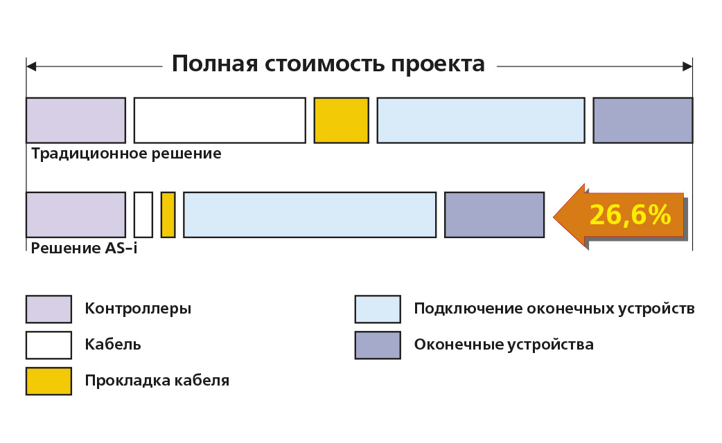 Приблизительная динамика структуры цены проекта при переходе с традиционного централизованного решения на сеть AS-интерфейса показана на рис. 3. Приведенная диаграмма характеризует конкретный проект и совершенно необязательно будет справедлива во всех случаях. Более того, для участка техпроцесса с небольшой протяженностью линий связи и небольшим количеством точек ввода-вывода дополнительные расходы на компоненты AS-интерфейса могут даже перевесить экономию, полученную за счёт минимизации кабельного хозяйства. Однако даже в этом случае такие преимущества AS-интерфейса, как гибкость, надежность и модифицируемость, остаются в силе вне зависимости от затрат начального этапа развертывания комплекса.