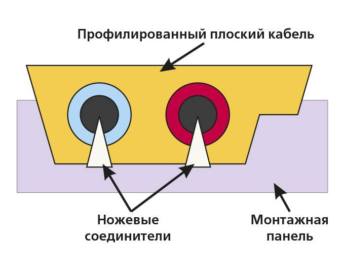 Быстрое и надежное подключение узлов к кабелю обеспечивается с помощью специальной конструкции. Каждое устройство AS-интерфейса устанавливается на монтажную панель (в разных источниках встречаются и такие названия, как модуль связи и «нижний» модуль), в которую предварительно укладывается кабель. В нижней части корпуса монтируемого устройства находятся ножевые контакты, прорезающие кабель и обеспечивающие непосредственный контакт с токоведущими жилами. Несимметричная форма кабеля гарантирует точное попадание контактов в сердечник проводников и абсолютно надежное соединение в течение всего срока эксплуатации. Материал, из которого изготавливается оболочка кабеля, обладает свойством самовосстановления без нарушения герметичности при снятии устройства. Эксплуатация кабеля допускается в диапазоне температур от –40 до +85°С, но монтаж может осуществляться только при температурах выше –25°С, так как при более низких температурах изоляция может быть повреждена в местах изгиба.