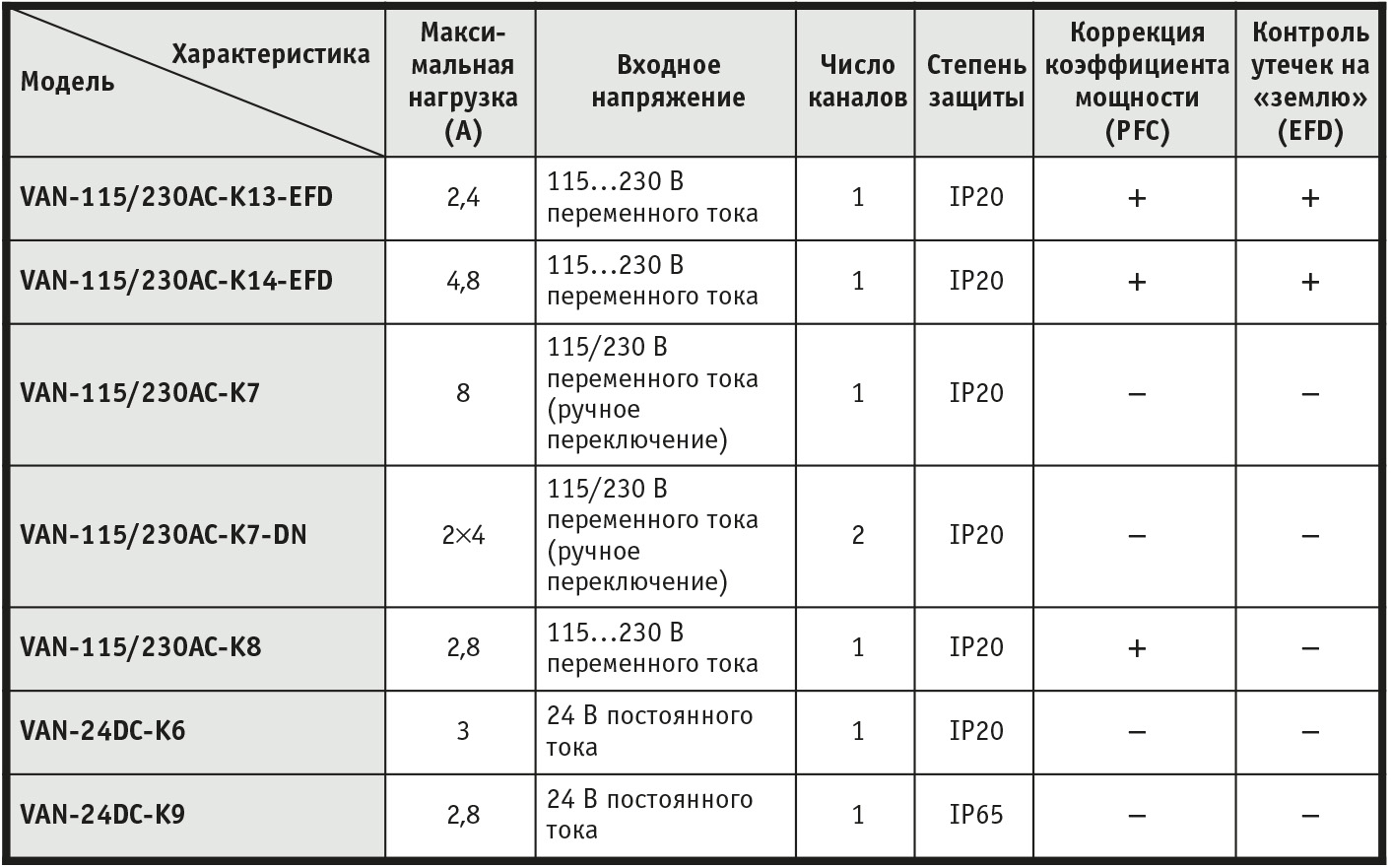 Фирма Pepperl+Fuchs выпускает ряд AS-i совместимых источников электропитания для сетей AS-интерфейса, отличающихся прежде всего мощностью (табл. 1), благодаря чему пользователи могут подобрать оптимальное решение в соответствии с количеством подключенных датчиков и исполнительных механизмов. В зависимости от выбора модели максимальный ток в сети может достигать от 2,4 до 8 А. Блоки электропитания защищены от короткого замыкания, а также могут быть снабжены контурами коррекции коэффициента мощности (PFC) и контроля утечек на «землю» (EFD).