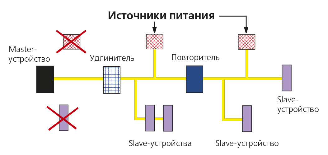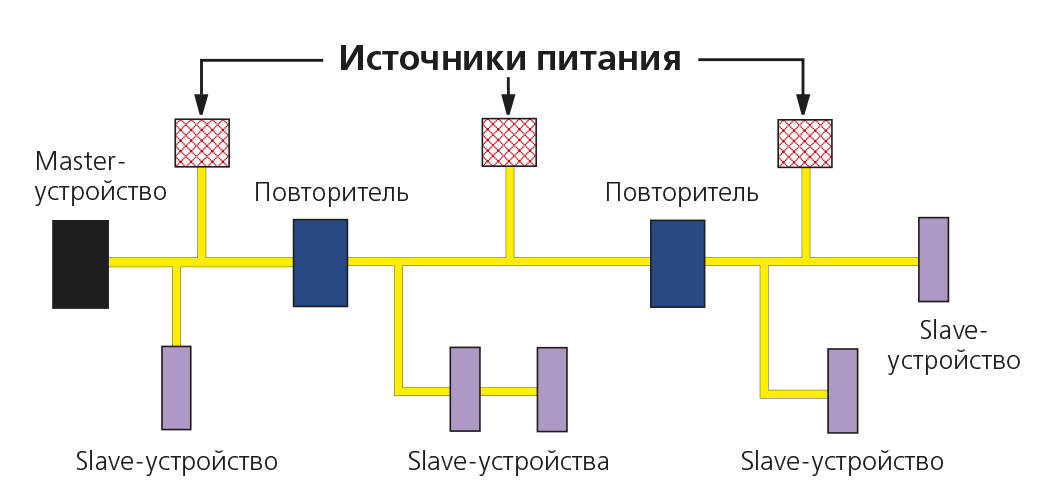 максимальная суммарная протяженность линий связи сегмента сети, обслуживаемого одним ведущим устройством, — 300 м (с использованием повторителей);