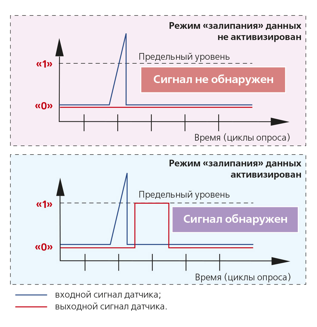 удаленно активизировать режим «залипания» данных для достоверной фиксации очень коротких (менее длительности цикла опроса) выбросов входного сигнала (рис. 16).