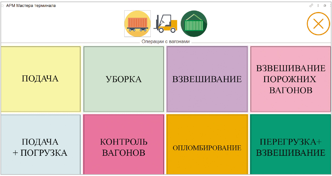 Рабочее место «Мастер терминала» (рис. 2) посредством планшета позволяет отражать в системе все проводимые операции с вагонами, грузами и контейнерами, позволяет получить мастерам аналитику по остаткам грузов и вагонам на терминале.