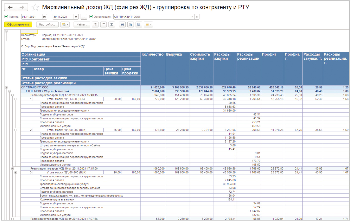 - Отчёт «Маржинальный доход ж. д.» (рис. 5) отражает финансовый результат по оптовой продаже товаров, перевозимых ж.-д. транспортом в детальном разрезе по статьям расходов по закупке товара и коммерческим расходам, а также финансовый результат по комплексу услуг по транспортировке груза железнодорожным транспортом.