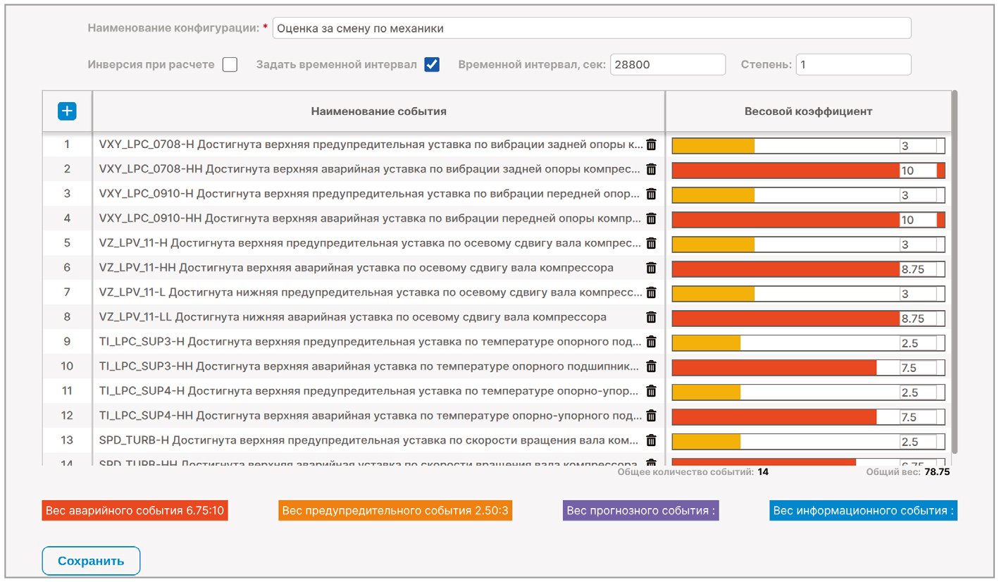 Выбор перечня событий для конфигураций и подбор значений весовых коэффициентов должны производиться согласованно со специалистами, которые будут эти оценки анализировать.