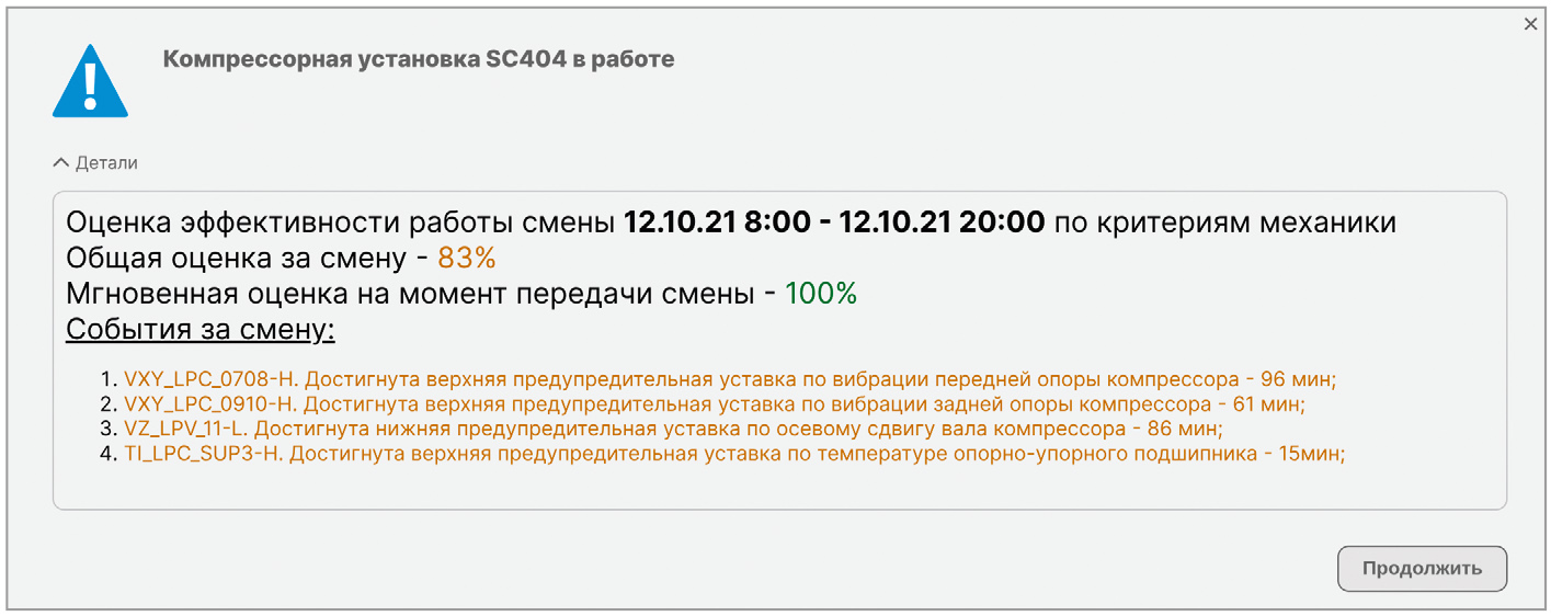 - количество предупредительных и аварийных событий за смену;