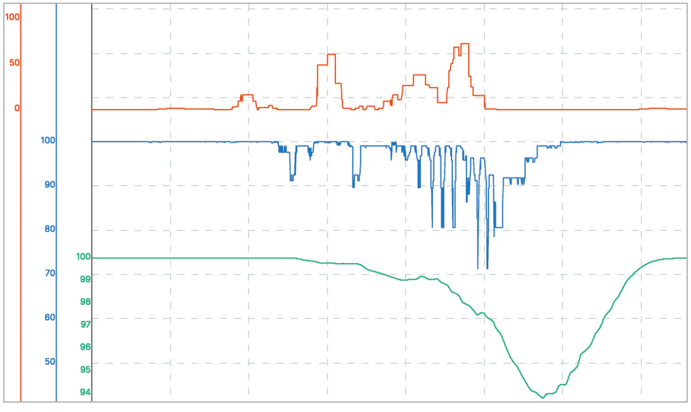 Из диаграммы видно, что степень деградации начинает расти как минимум за 30 минут до снижения мгновенной оценки эффективности – фактической регистрации негативных событий.