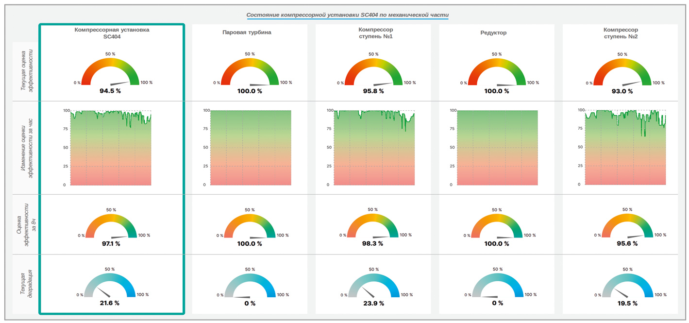 Дашборд разделён на 5 областей, каждая из которых содержит информацию по определённому механизму: «Компрессорная установка SC404» – область, содержащая обобщённую информацию по всей компрессорной установке, «Паровая турбина» – область, содержащая информацию только по паровой турбине, и т.д.