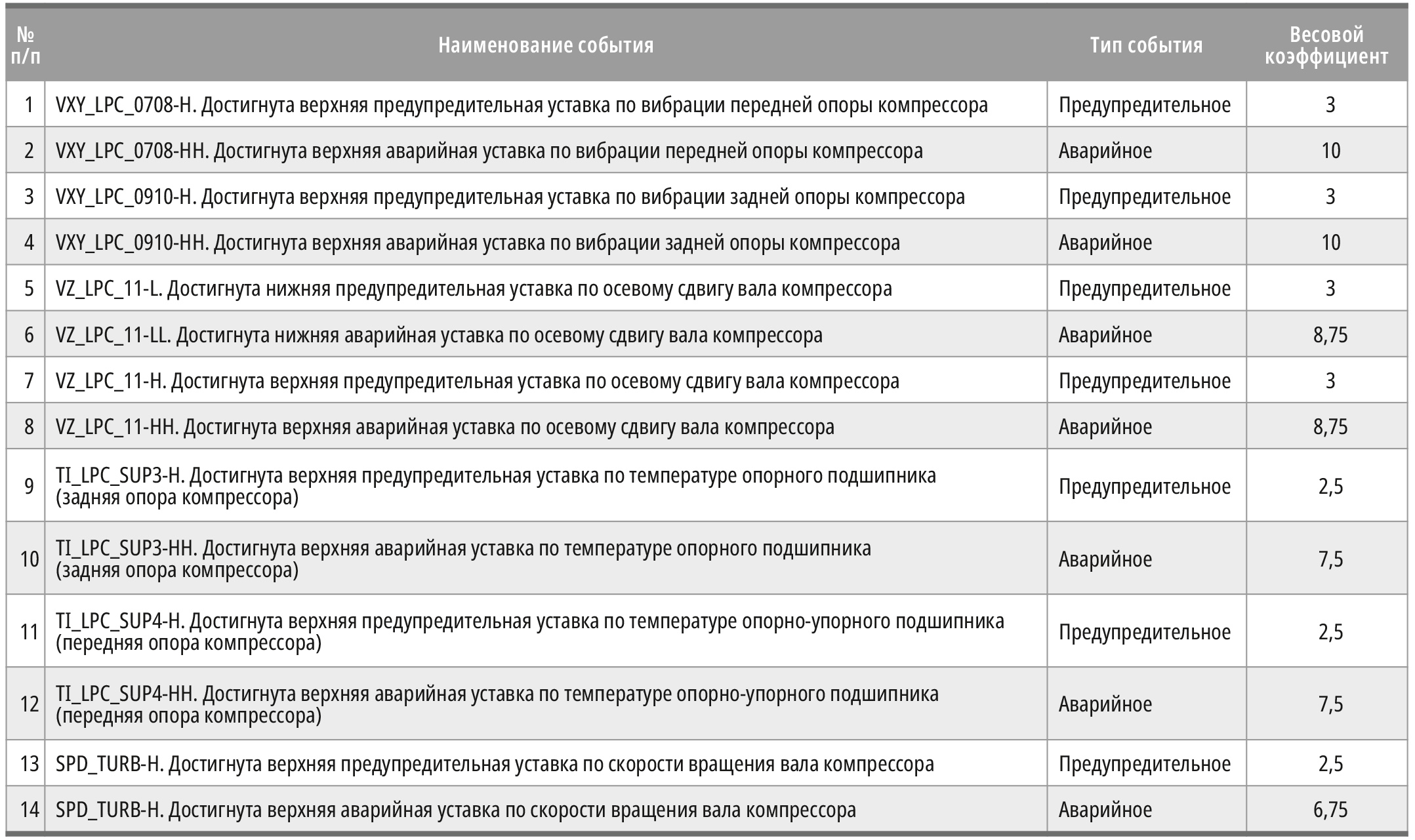 Для оценки степени деградации нашего компрессора по механической части в конфигурации мгновенной интегральной оценки мы предусмотрим события, приведённые в табл. 3.