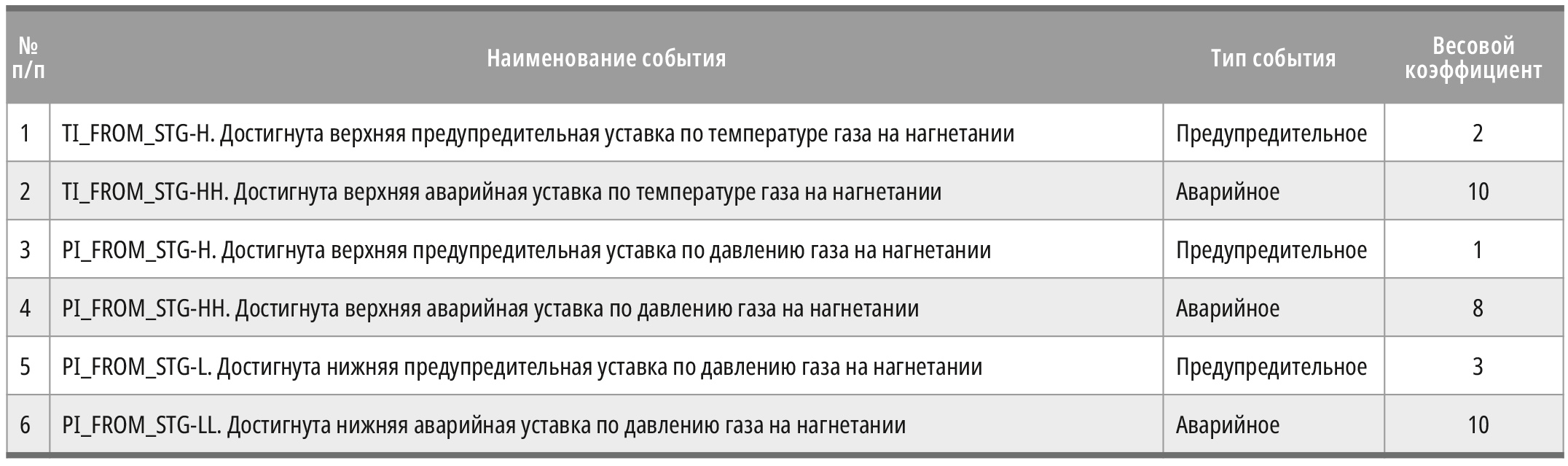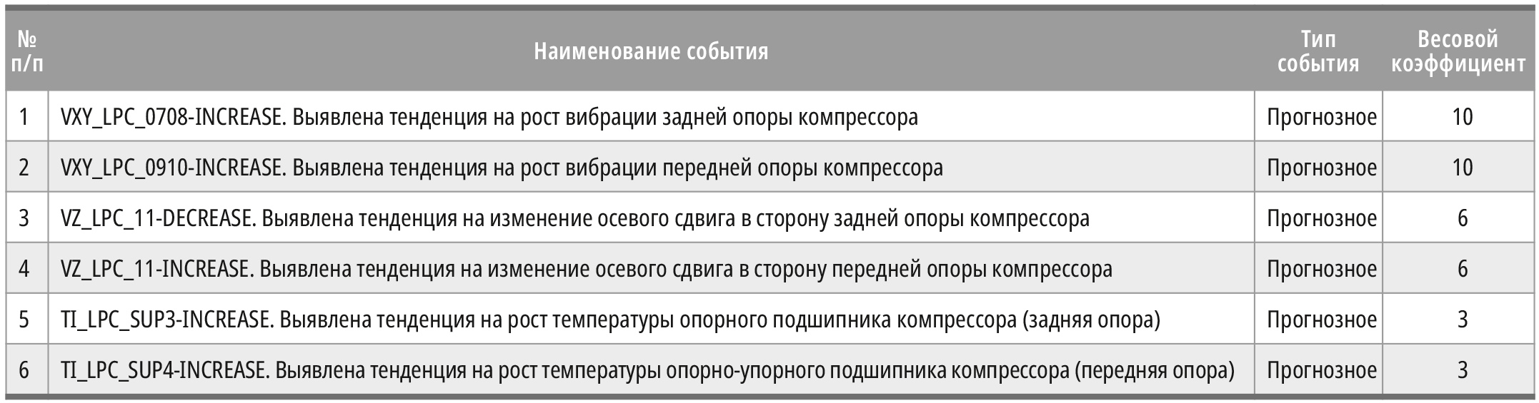 Для главного технолога, отвечающего за соблюдение технологического режима, в конфигурацию интегральной оценки того же компрессора попадут всего 6 событий, представленных в табл. 2.