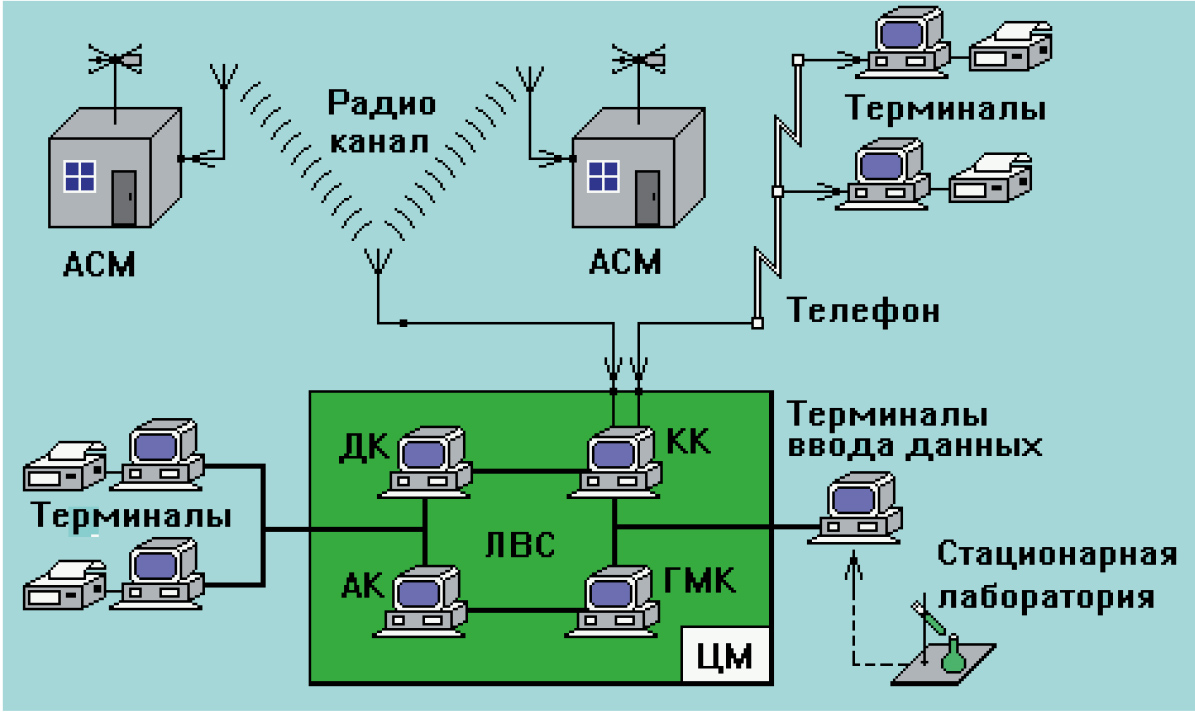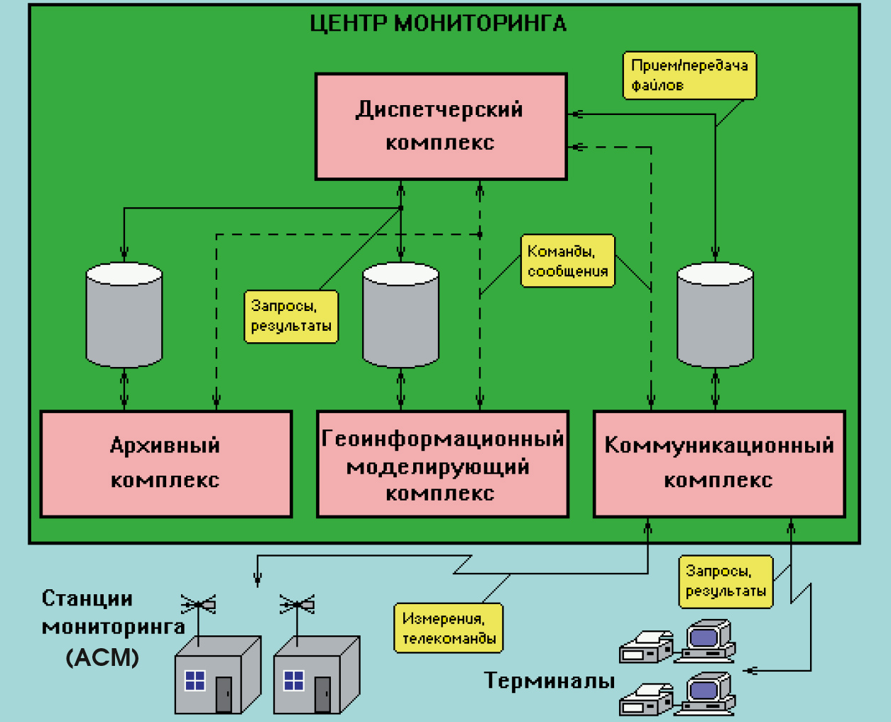 - диспетчерский комплекс (ДК), предназначенный для оперативной обработки принятой информации, отображения текущей экологической ситуации и управления работой измерительной сети;