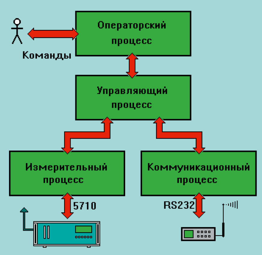 Измерительный процесс выполняет элементарные действия по обслуживанию платы 5710 — опрос аналоговых и цифровых входов, выдача сигналов на цифровые выходы и т. п. Коммуникационный процесс обеспечивает передачу данных. Контроллер пакетной радиосвязи KPC-3 подключается к одному из последовательных портов платы 5025A. Операторский процесс запускается по необходимости и обслуживает работу пользователя-оператора. Все действия синхронизируются управляющим процессом, который посылает команды другим процессам и принимает от них данные и сообщения о выполнении команд. В управляющий процесс заложены алгоритмы решения всех задач измерения, поддержки жизнеспособности станции, реакции на различные события и обмена информацией с Центром мониторинга. Режимы работы программного обеспечения станции задаются на основе системы конфигурационных файлов.