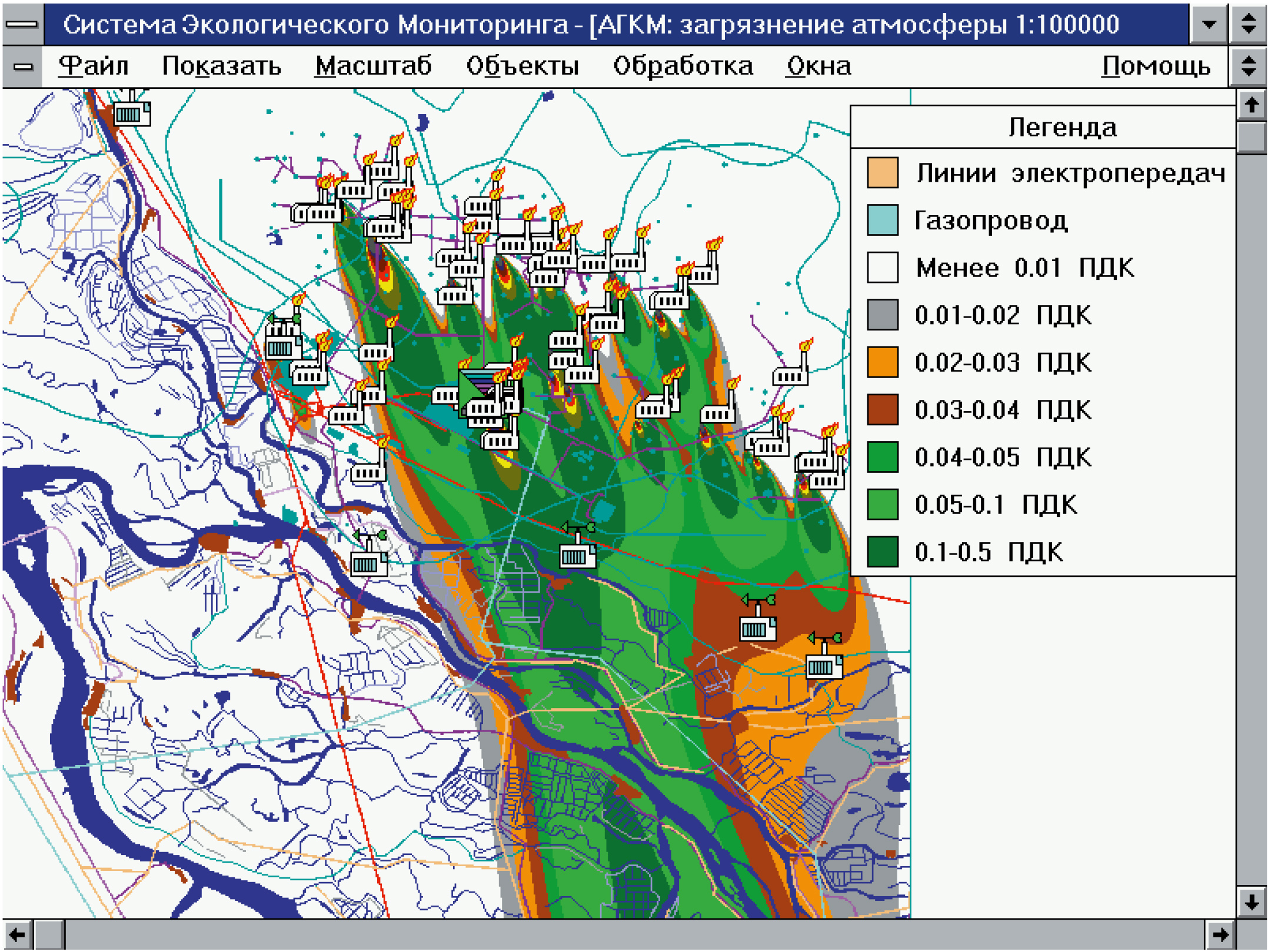 Геоинформационный моделирующий комплекс включает в себя обширную картографическую базу данных о территории (карты расположения источников и реципиентов загрязнений, природных ландшафтов, рельефа, почв, речной сети и др.) и позволяет в реальном времени на основе методов математического моделирования путем решения прямых и обратных задач переноса составлять карты текущих и прогнозируемых загрязнений контролируемой территории (рис. 6). Кроме того, ГМК поз-воляет разыгрывать в диалоге с пользователем различные сценарии развития экологической обстановки в случае принятия тех или иных управленческих решений.