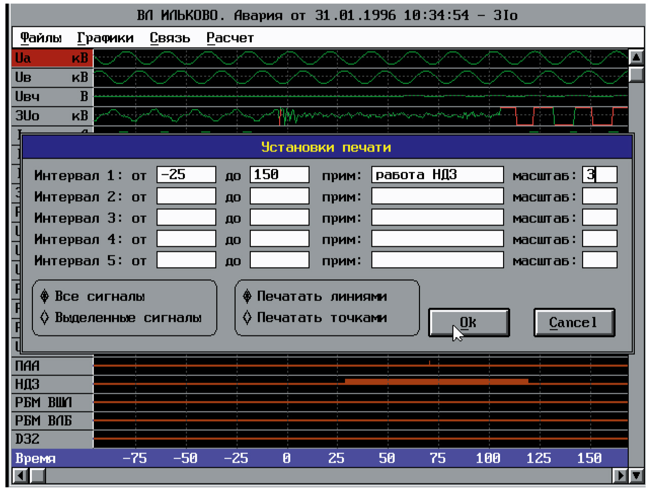 - распечатка на принтере выбранных оператором каналов в заданные интервалы времени с возможностью указания действующих значений.